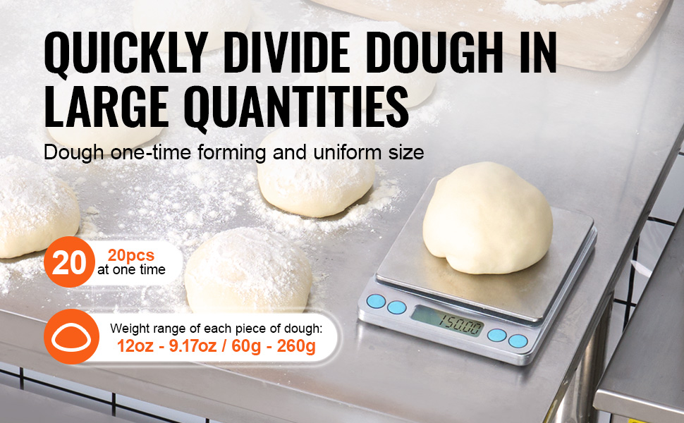 Přístroj dokáže rozdělit velké těsto na 20 rovnoměrně velkých porcí najednou, přičemž každá porce váží od 60 do 260 gramů (2,12 až 9,17 oz).