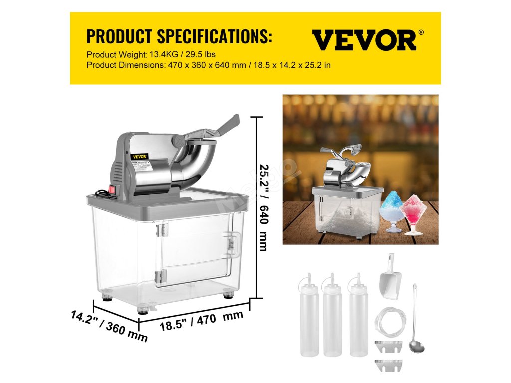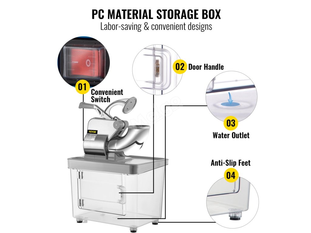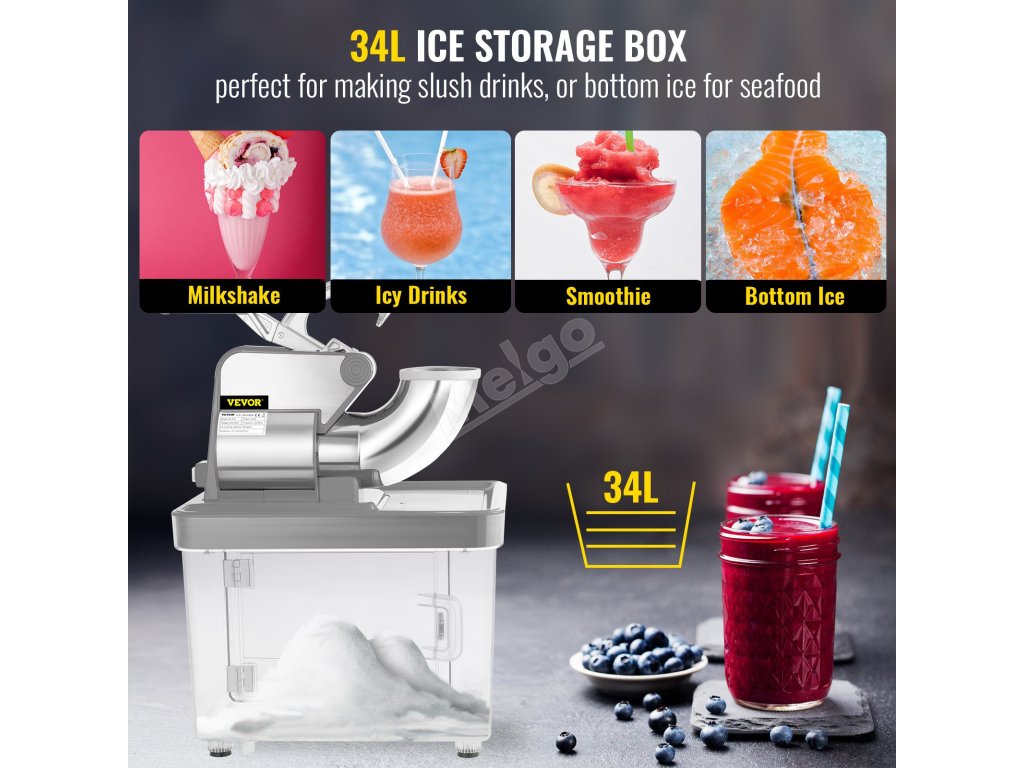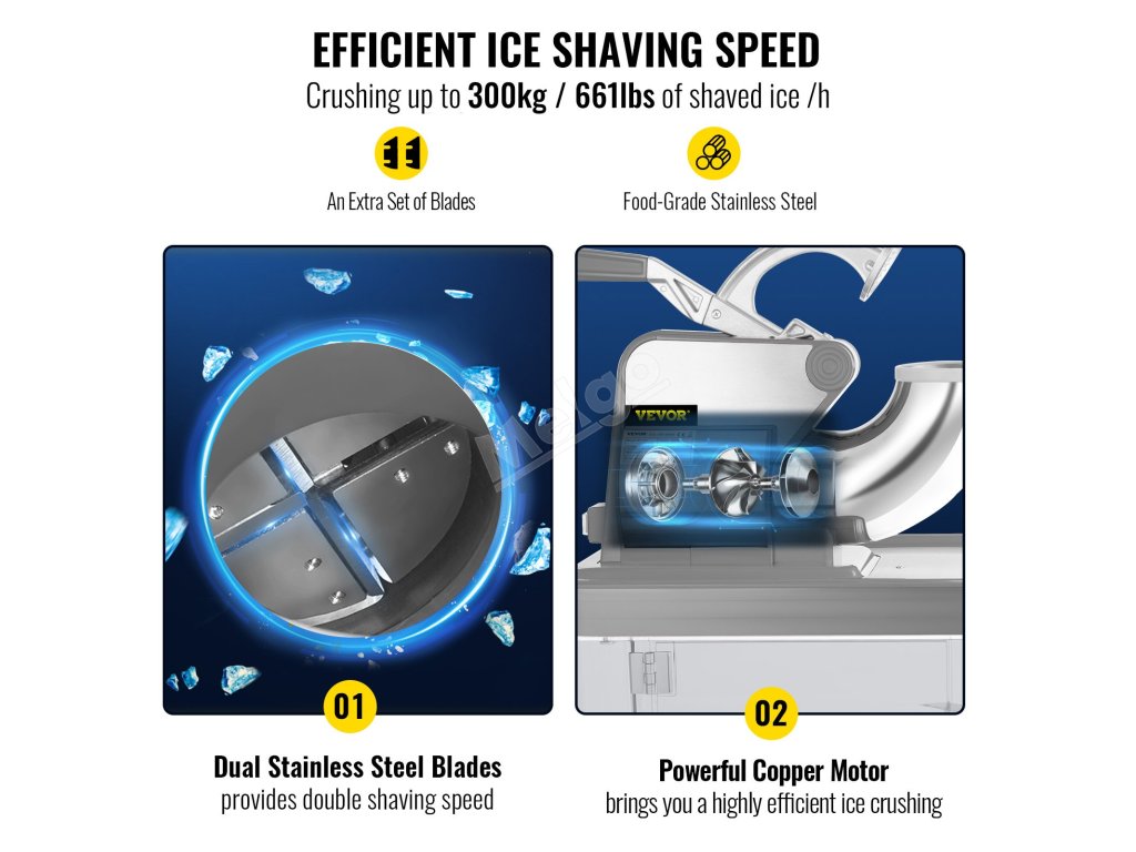 Tento stroj na zmrzlinu používá dvojité nože, které zajišťují dvojnásobnou rychlost holení, což je efektivnější než u jednoho nože. Množství rozdrceného ledu za hodinu může dosáhnout až 396,8 liber (180 kg).