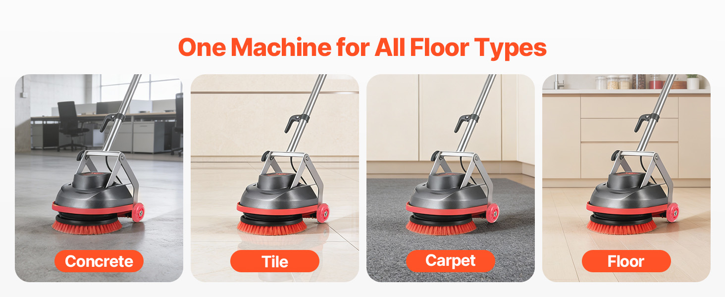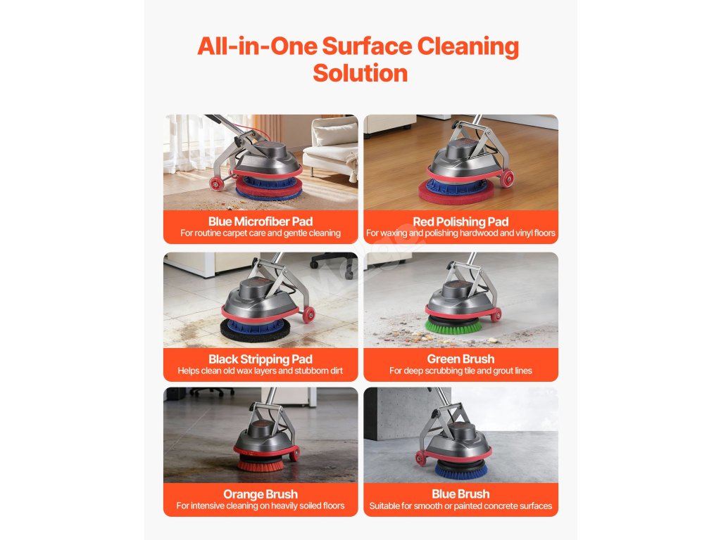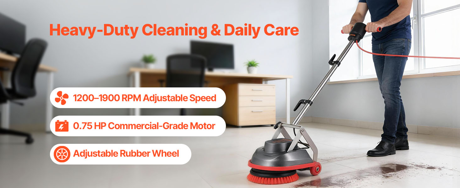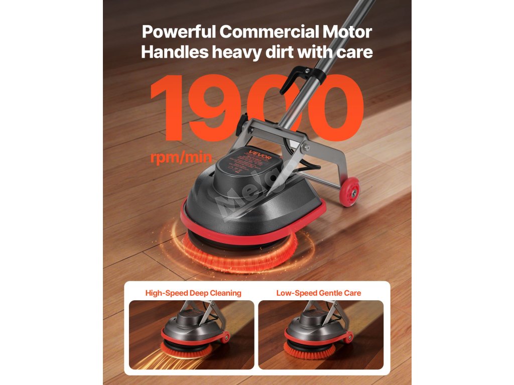 Náš podlahový mycí stroj je poháněn komerčním motorem o výkonu 0,75 HP s nastavitelnou rychlostí až 2 000 otáček za minutu, který zajišťuje výkonné odstraňování skvrn a zároveň je šetrný k citlivým podlahám.