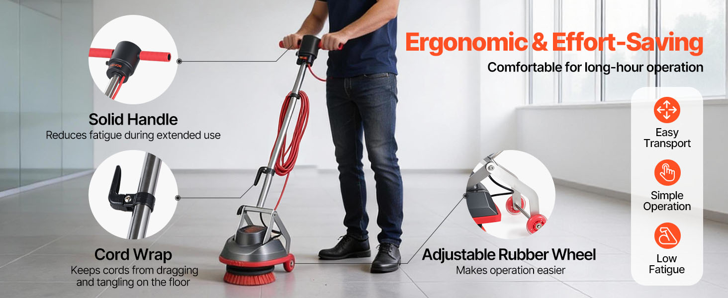 Díky optimalizovanému tělu, rukojeti a pružným kolečkům zajišťuje tato podlahová leštička stabilní a bezproblémovou práci po dlouhou dobu a účinně snižuje únavu.