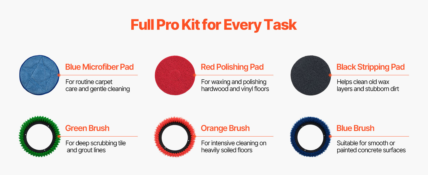 Náš leštič podlah je dodáván s kompletní sadou profesionálních kartáčových hlavic a padů, které jsou připraveny na všechny úkony od každodenního čištění až po hloubkové čištění.