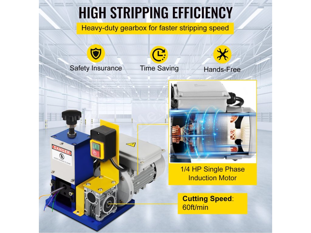 Čepel z legované oceli odolné proti opotřebení snadno a rychle prořízne i tu nejsilnější izolaci. Přímý válečkový pohon se šnekovým převodem. Tato kvalitní převodovka vede k vysoké rychlosti odizolování.