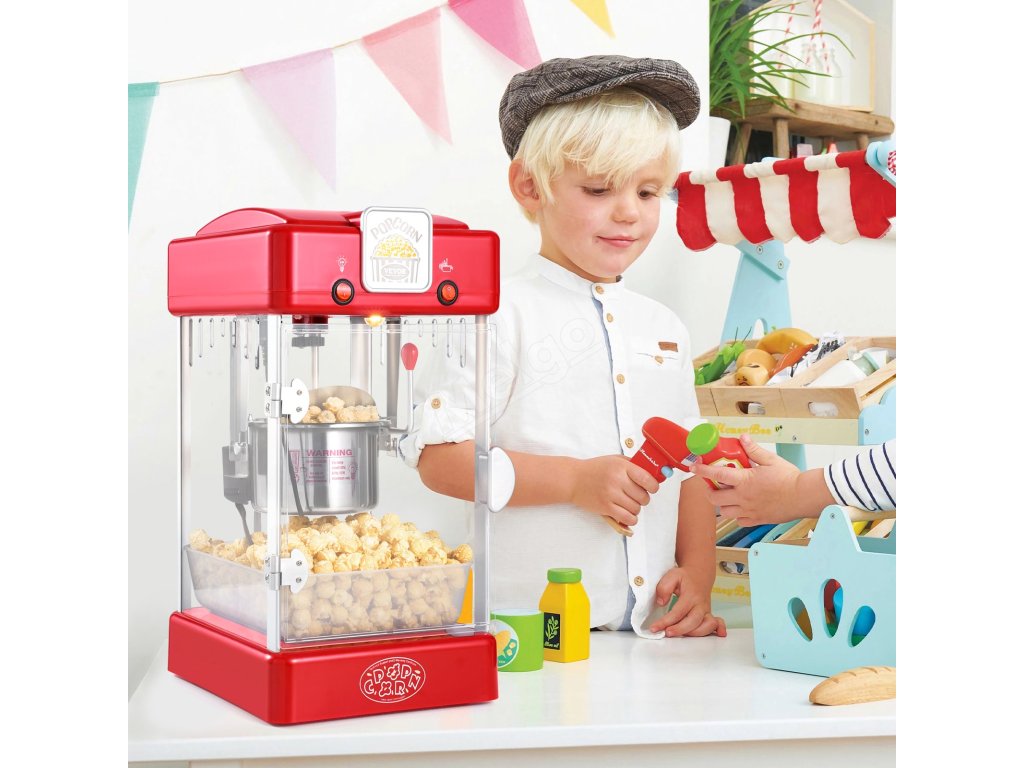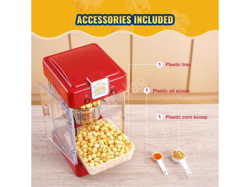 Nezávislý dvojitý spínač umožňuje, aby se popcornovač začal vařit; hotový popcorn spadne na ohřívací tác a zůstane čerstvý, dokud ho nebudete chtít podávat. Teplé 10W světlo jasně osvětlí váš popcorn.