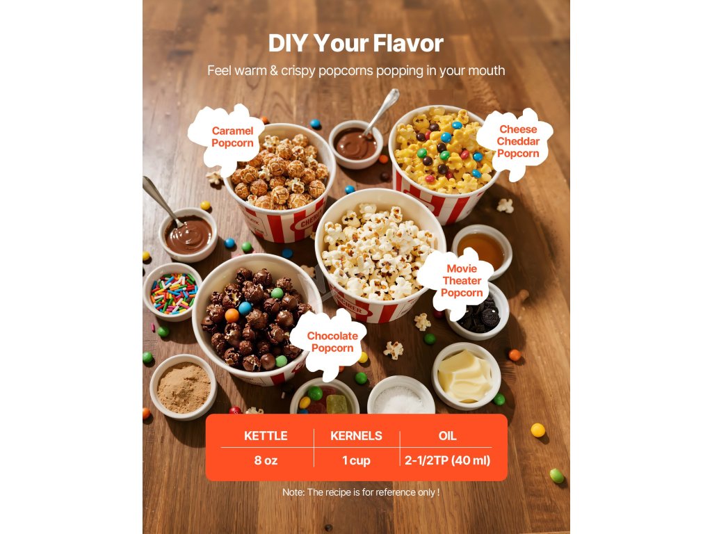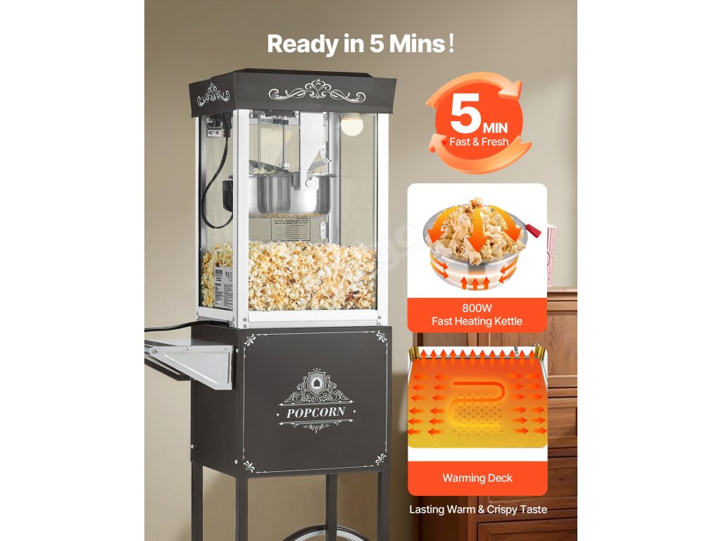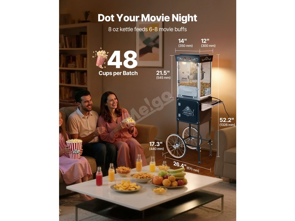 S tímto popkornovačem o objemu 8 oz na vozíku, který připraví až 48 šálků na jednu dávku a nasytí 6-8 osob, můžete připravovat kbelík čerstvého popcornu za kbelíkem. Nenechte si ujít tento lahodný doplněk pro domácí kina, zahradní párty, karnevaly, sportovní akce a další využití!