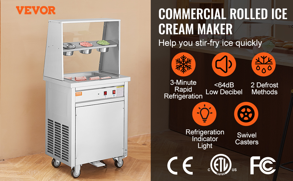 Tento stroj na smaženou zmrzlinu je vybaven integrovaným kompresorem a pracuje při teplotách v rozmezí 5-38 ℃/41-100,4 ℃℉, což umožňuje rychlé zmrazení za méně než 3 minuty. Díky hlučnosti pod 64 dB během provozu můžete bez námahy vytvářet různé příchutě zmrzliny a pochoutky.