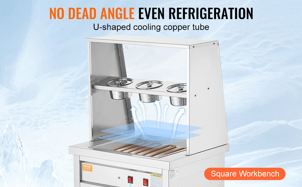Náš válcovaný zmrzlinovač je vybaven vestavěným chladicím systémem z měděných trubek ve tvaru písmene U, který eliminuje mrtvé úhly a výrazně zvyšuje účinnost chlazení. Velká pracovní plocha poskytuje dostatek pracovního prostoru a zabraňuje rozlití výrobku.