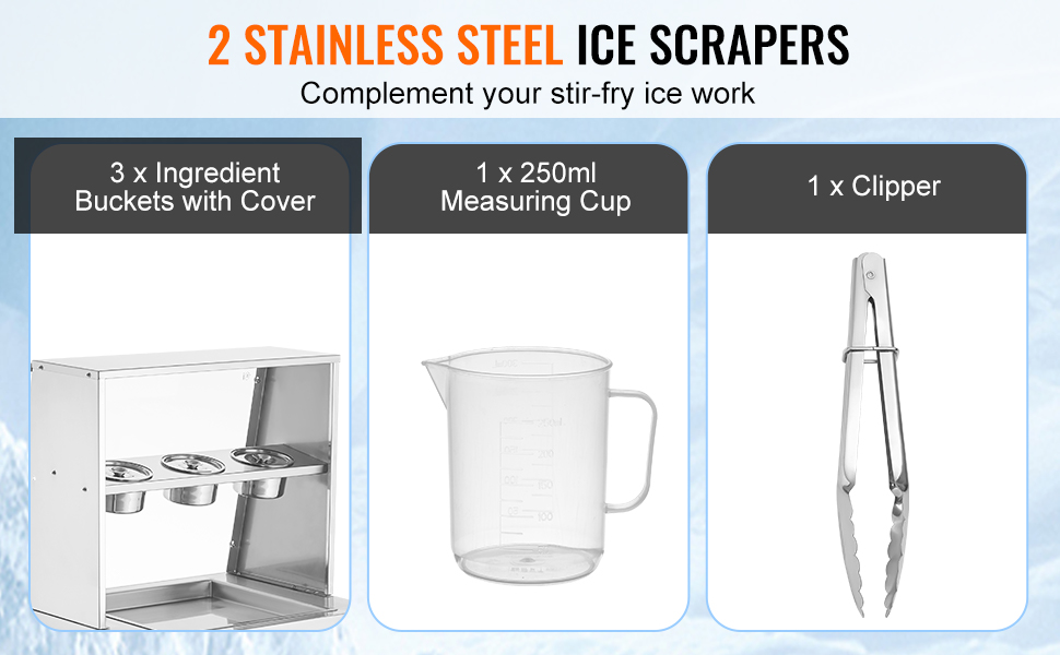Stroj na smaženou zmrzlinu se dodává se 2 nerezovými škrabkami na led s dřevěnými rukojeťmi a čepelemi z nerezové oceli. Díky 3 kbelíkům na ingredience s víčky, 1 ořezávači a 250ml odměrce hladce doplní vaši práci a zvýší efektivitu a pohodlí.