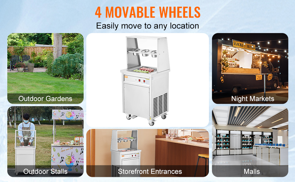 Škrabka na zmrzlinu je vybavena 4 pohyblivými kolečky, včetně 2 otočných koleček s brzdou a 2 pevných koleček, takže ji můžete bez námahy přepravovat do venkovních zahrad, stánků, nákupních center, nočních trhů atd.
