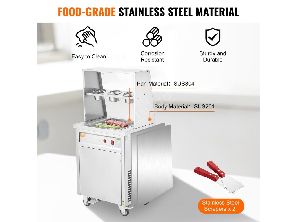 Stroj na smaženou zmrzlinu se dodává se 2 nerezovými škrabkami na led s dřevěnými rukojeťmi a čepelemi z nerezové oceli. Díky 3 kbelíkům na ingredience s víčky, 1 ořezávači a 250ml odměrce hladce doplní vaši práci a zvýší efektivitu a pohodlí.