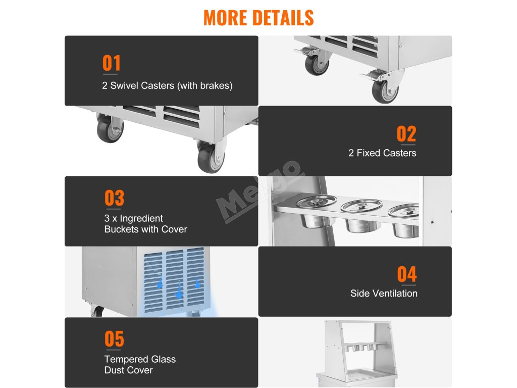 Škrabka na zmrzlinu je vybavena 4 pohyblivými kolečky, včetně 2 otočných koleček s brzdou a 2 pevných koleček, takže ji můžete bez námahy přepravovat do venkovních zahrad, stánků, nákupních center, nočních trhů atd.