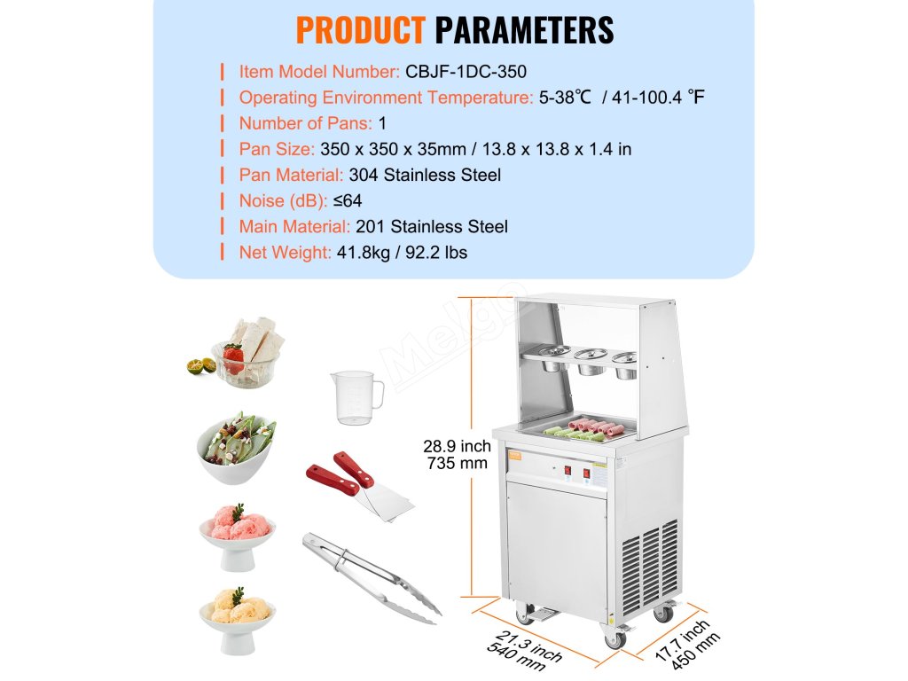 Tento stroj na smaženou zmrzlinu je vybaven integrovaným kompresorem a pracuje při teplotách v rozmezí 5-38 ℃/41-100,4 ℃℉, což umožňuje rychlé zmrazení za méně než 3 minuty. Díky hlučnosti pod 64 dB během provozu můžete bez námahy vytvářet různé příchutě zmrzliny a pochoutky.