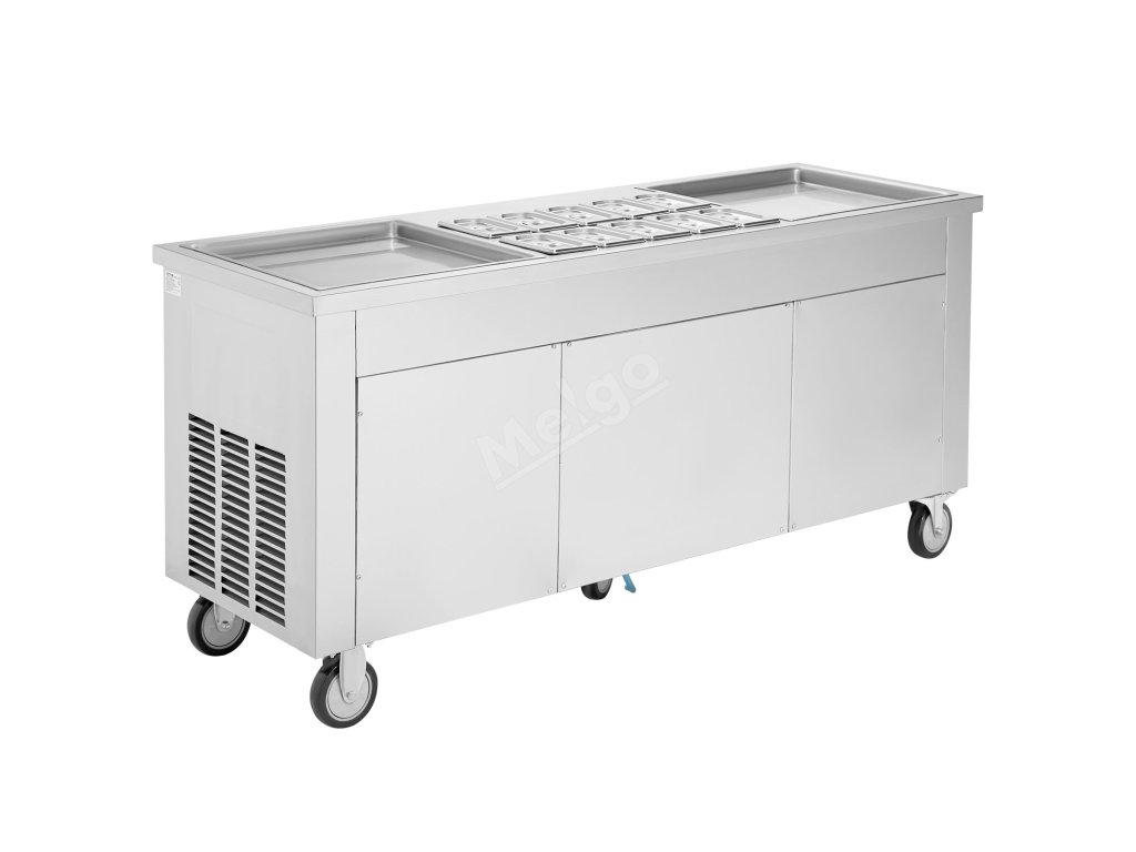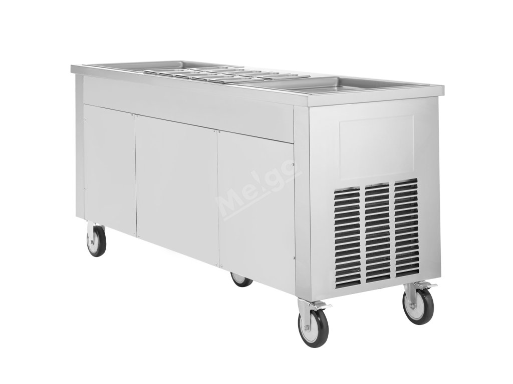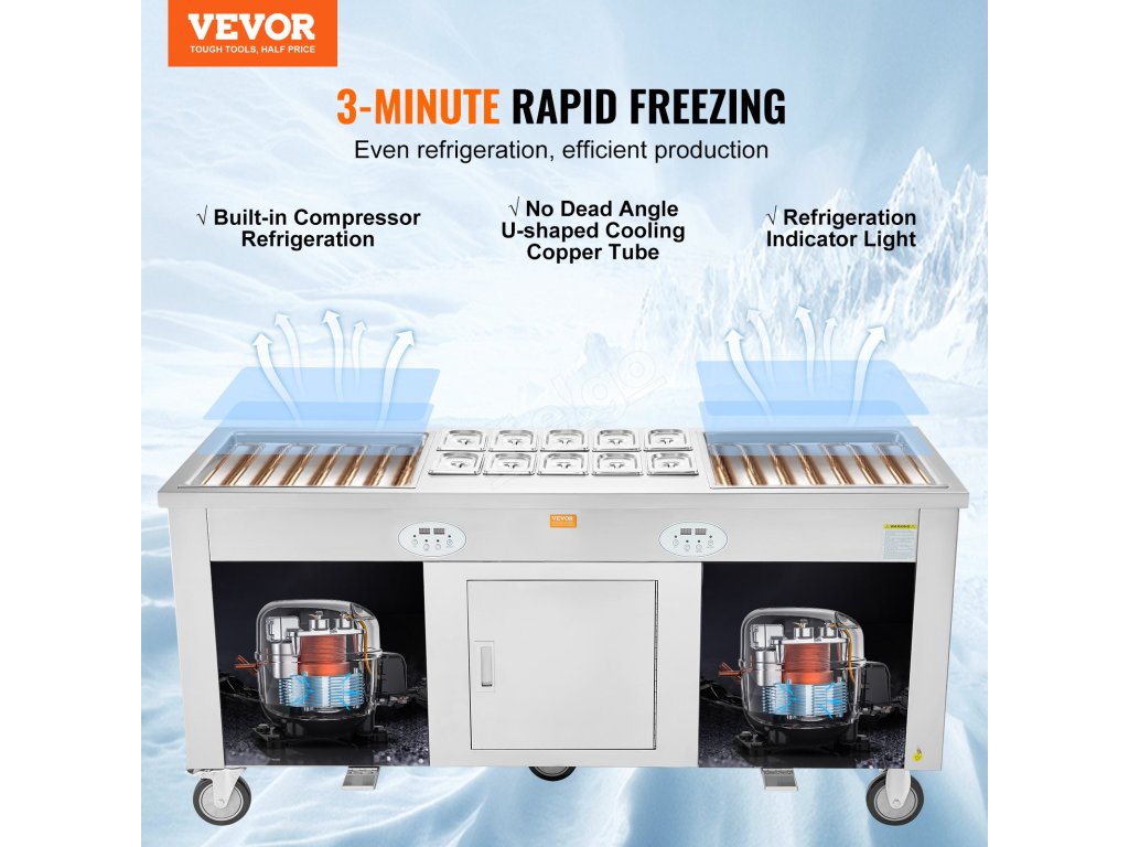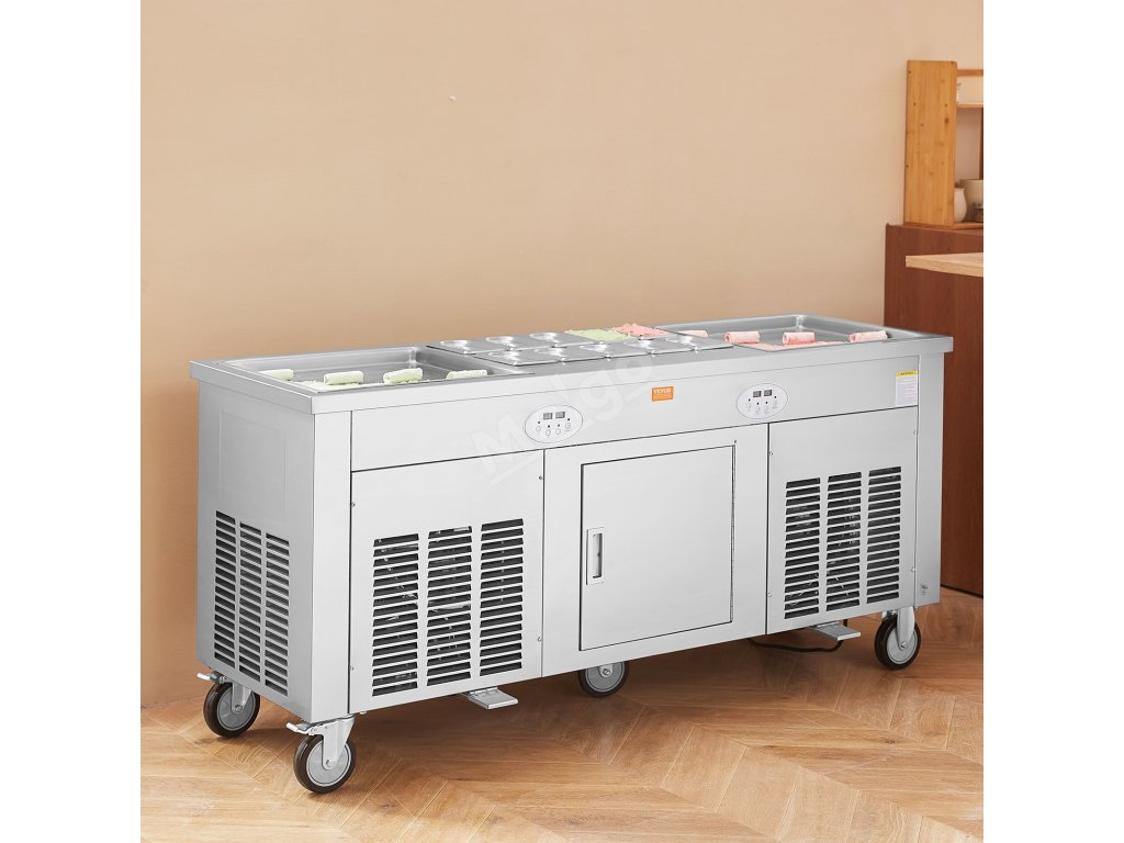 Náš válcovaný zmrzlinovač je vybaven vestavěným chladicím systémem z měděných trubek ve tvaru písmene U, který eliminuje mrtvé úhly a výrazně zvyšuje účinnost chlazení. Dva pracovní stoly čtvercových rozměrů poskytují dostatek pracovního prostoru a zabraňují rozlití výrobku.