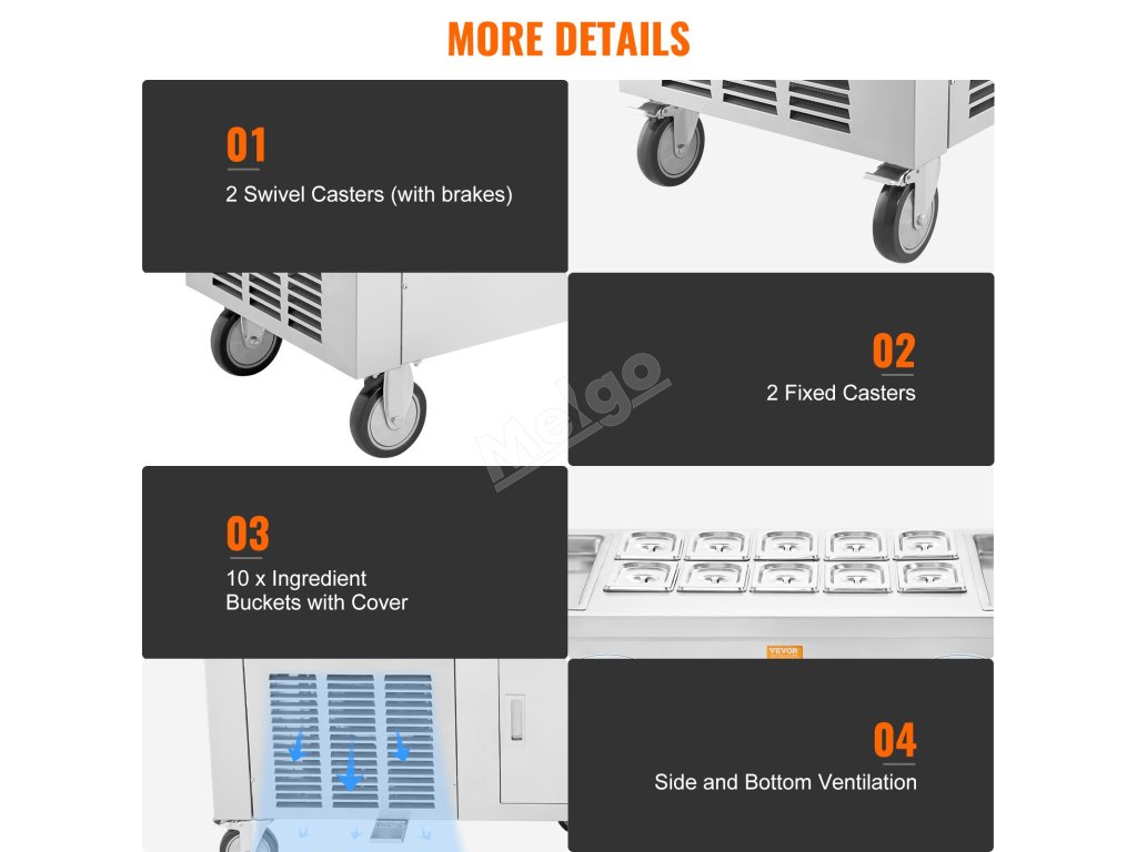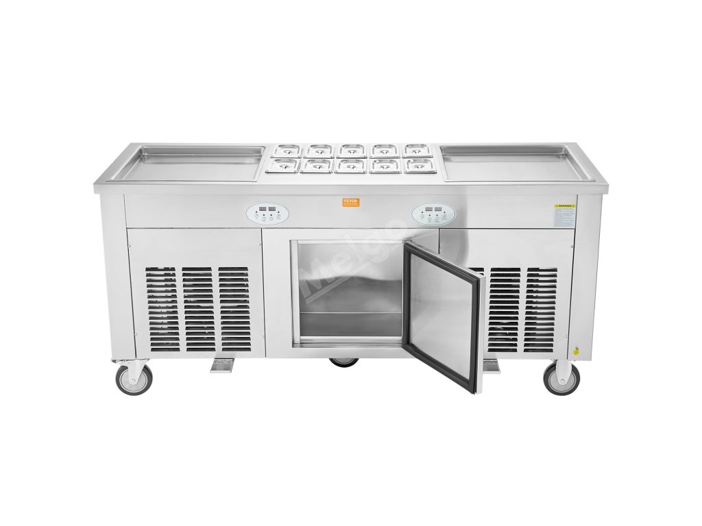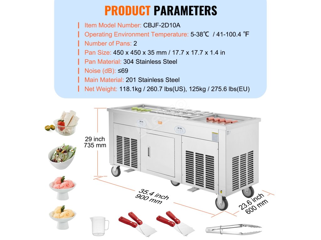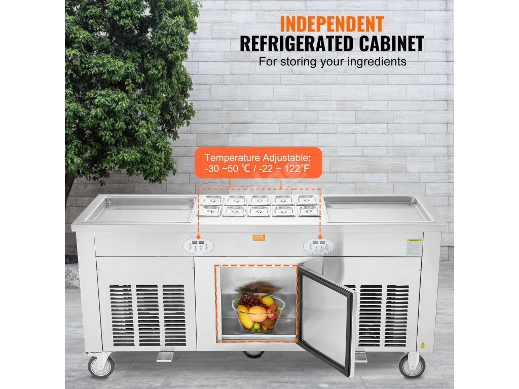 Náš válcovaný zmrzlinovač je vybaven vestavěným chladicím systémem z měděných trubek ve tvaru písmene U, který eliminuje mrtvé úhly a výrazně zvyšuje účinnost chlazení. Dva pracovní stoly čtvercových rozměrů poskytují dostatek pracovního prostoru a zabraňují rozlití výrobku.