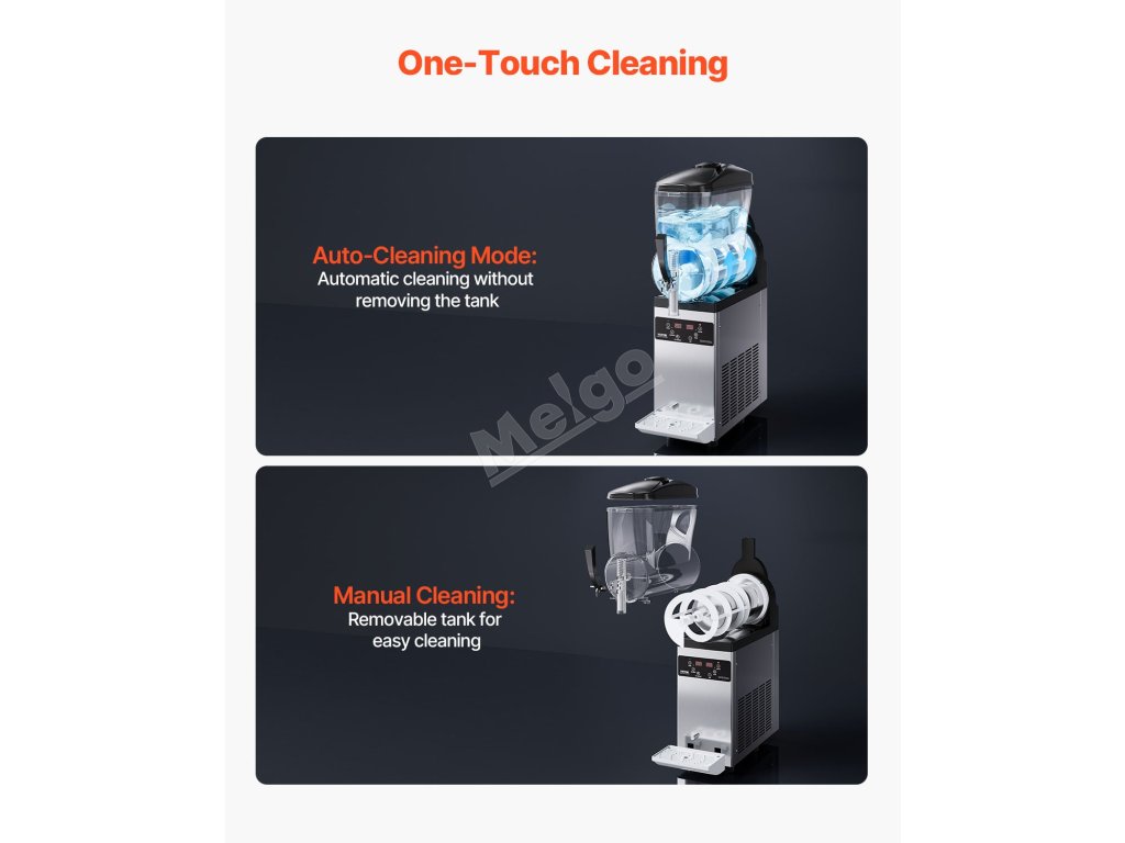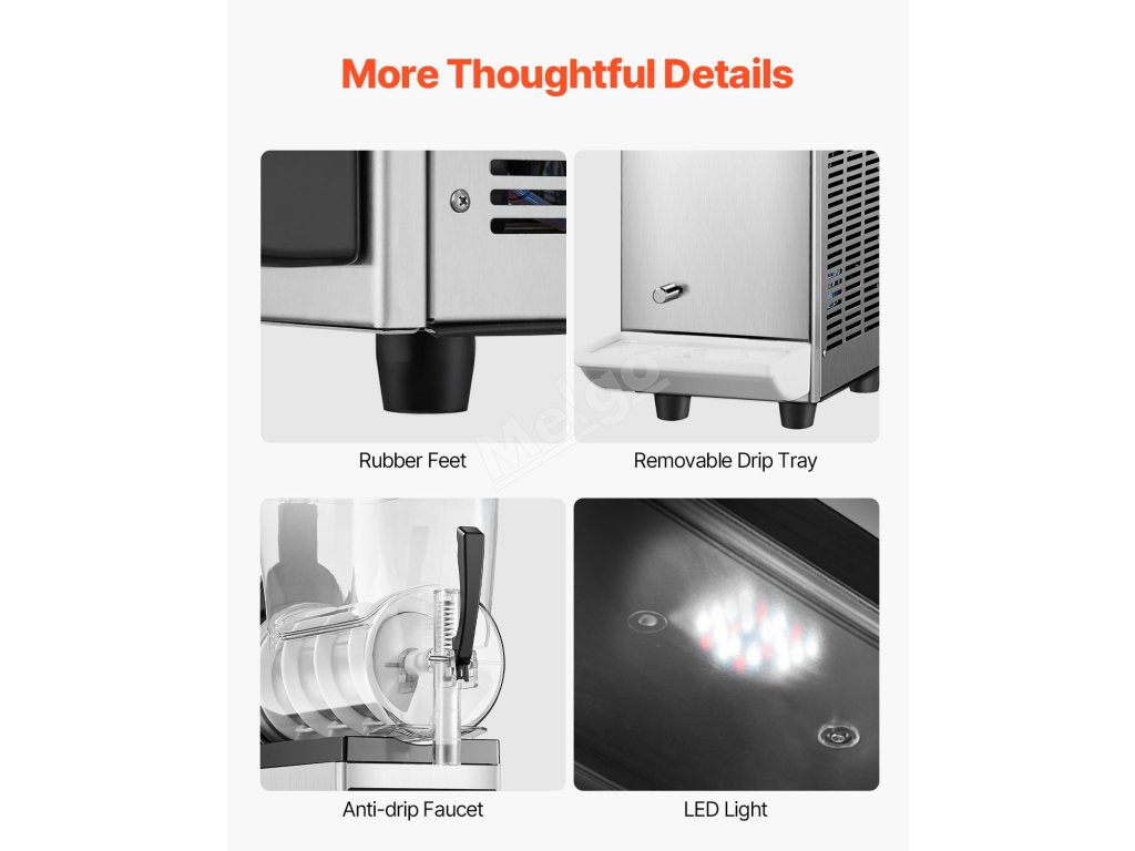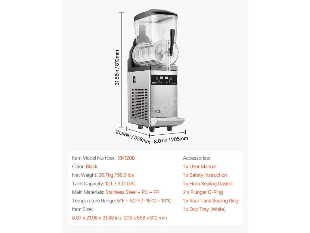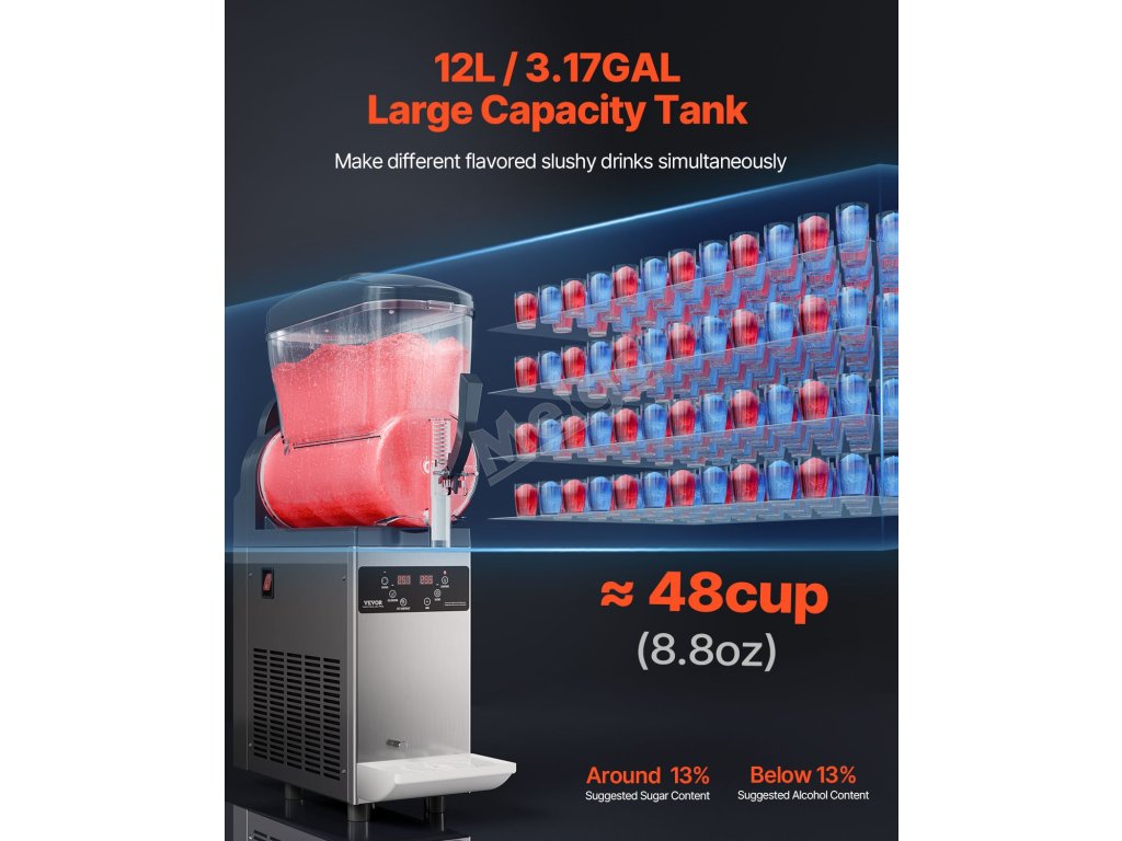 Tento komerční výrobník břečky má nádrž o objemu 12 l/3,17 GAL, tělo z nerezové oceli a nádrž z PC, které nabízejí odolné a zdravotně nezávadné materiály.