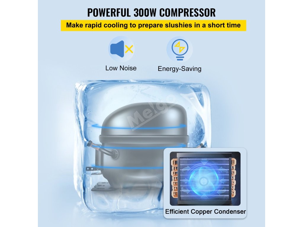 Výkonný chladicí systém tohoto bahenního stroje tvoří 300W kompresor a měděný kondenzátor. Jeho rychlý chladicí výkon vám umožní připravit bahenní nápoje v krátkém čase.
