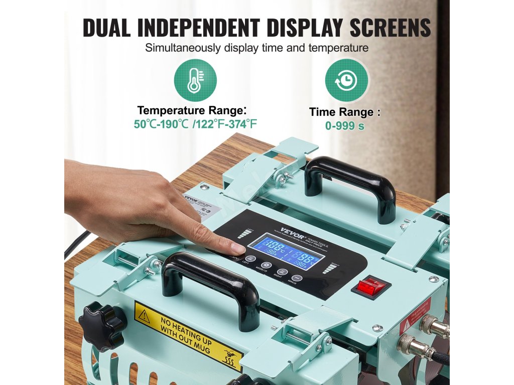 Můžete nezávisle ovládat čas a teplotu obou stanic a přepínat mezi ℃ a ℉ podle svých preferencí. Náš tepelný lis na hrnky je uživatelsky přívětivý a ideální pro začátečníky.