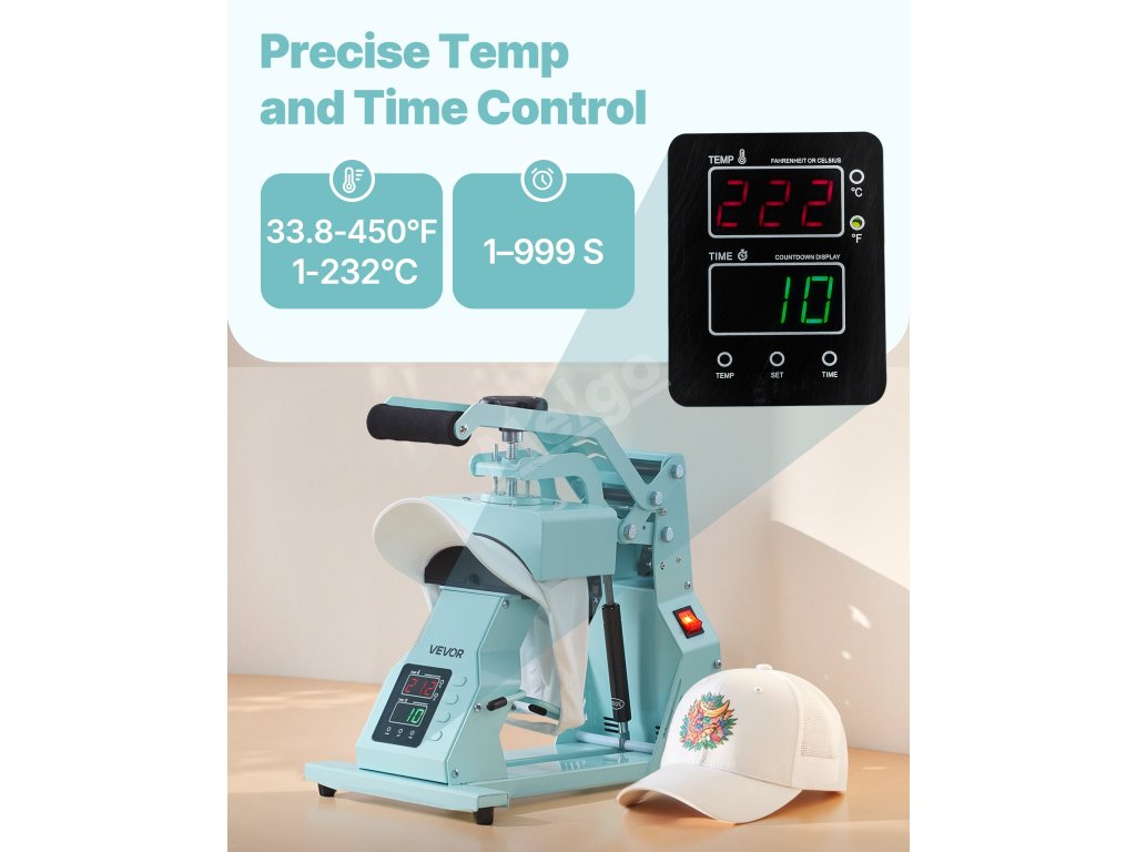 Náš tepelný lis na klobouky umožňuje přesnou regulaci teploty (33,8 - 450) a času (až 999 s) pro optimální potisk různých materiálů. Součástí balení je několik desek na klobouky pro sublimační papír, polyester, bavlnu atd. Je ideální pro začátečníky i profesionály a zajišťuje snadné použití.