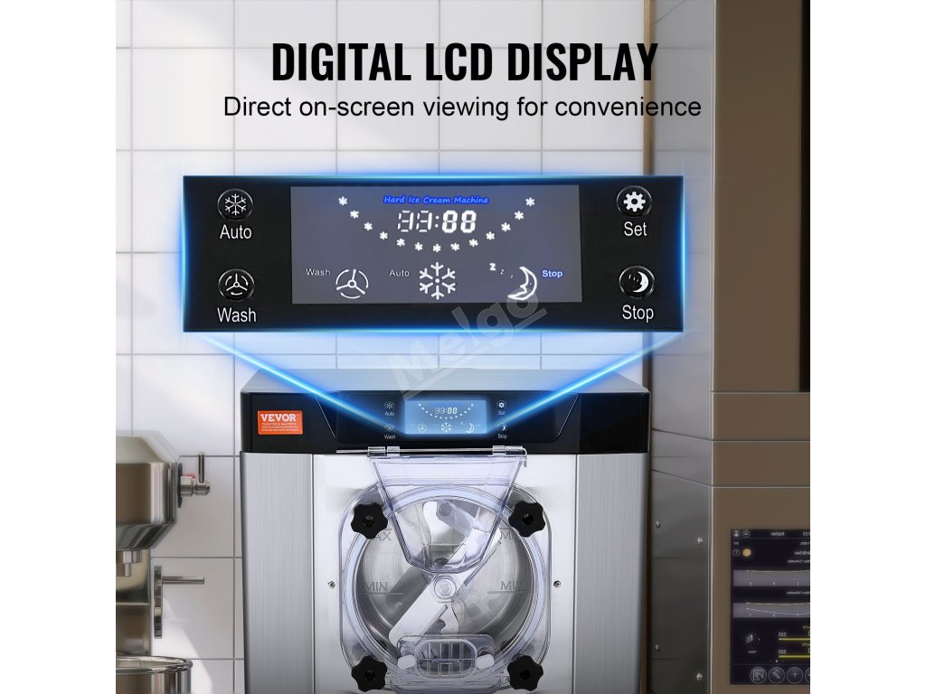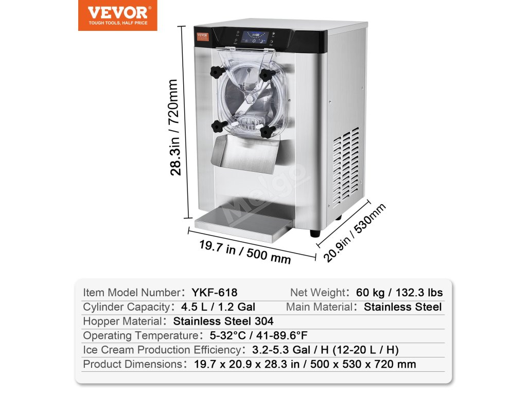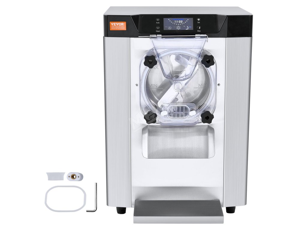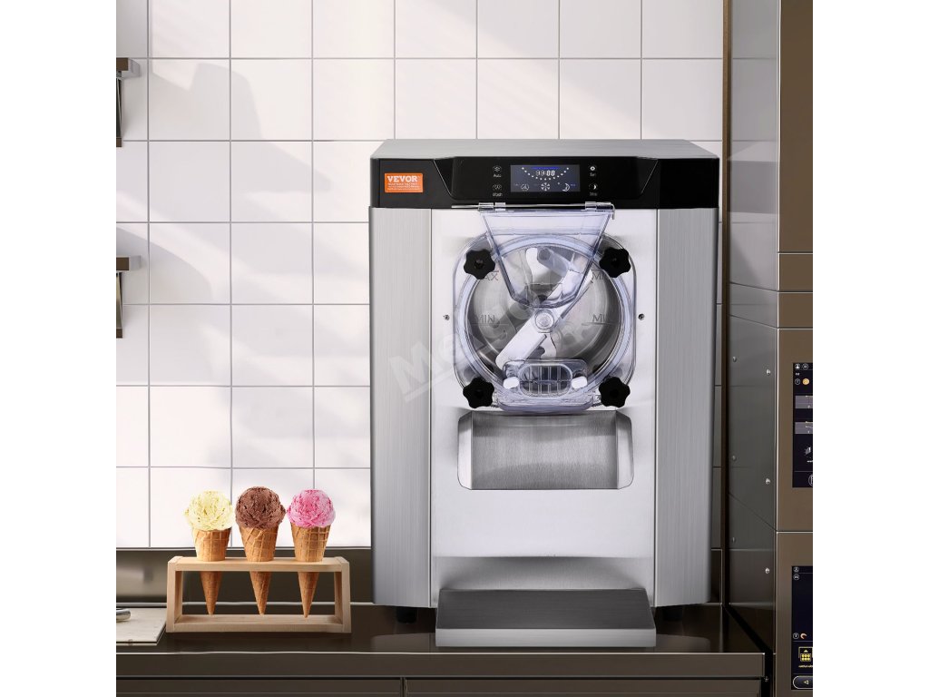 Tento komerční stolní zmrzlinovač vyrobí zmrzlinu za pouhých 20 minut. S výkonným kompresorem, který pracuje tiše s hlučností nižší než 66 dB. Kapacita 4,5 l/1,2 galonu dokáže vyrobit 12 l/3,2 galonu za hodinu, což je ideální pro šlehání hladké tvrdé zmrzliny.