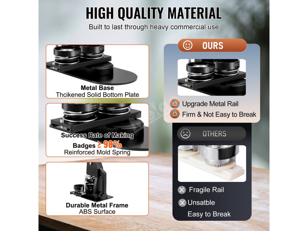 Dlouhá ergonomická rukojeť umožňuje pohodlnější držení. Mechanické ložisko zajišťuje hladký chod. To může ušetřit více námahy a zlepšit vaši efektivitu. Také zesílené pružiny mohou zvýšit úspěšnost výroby odznaků.