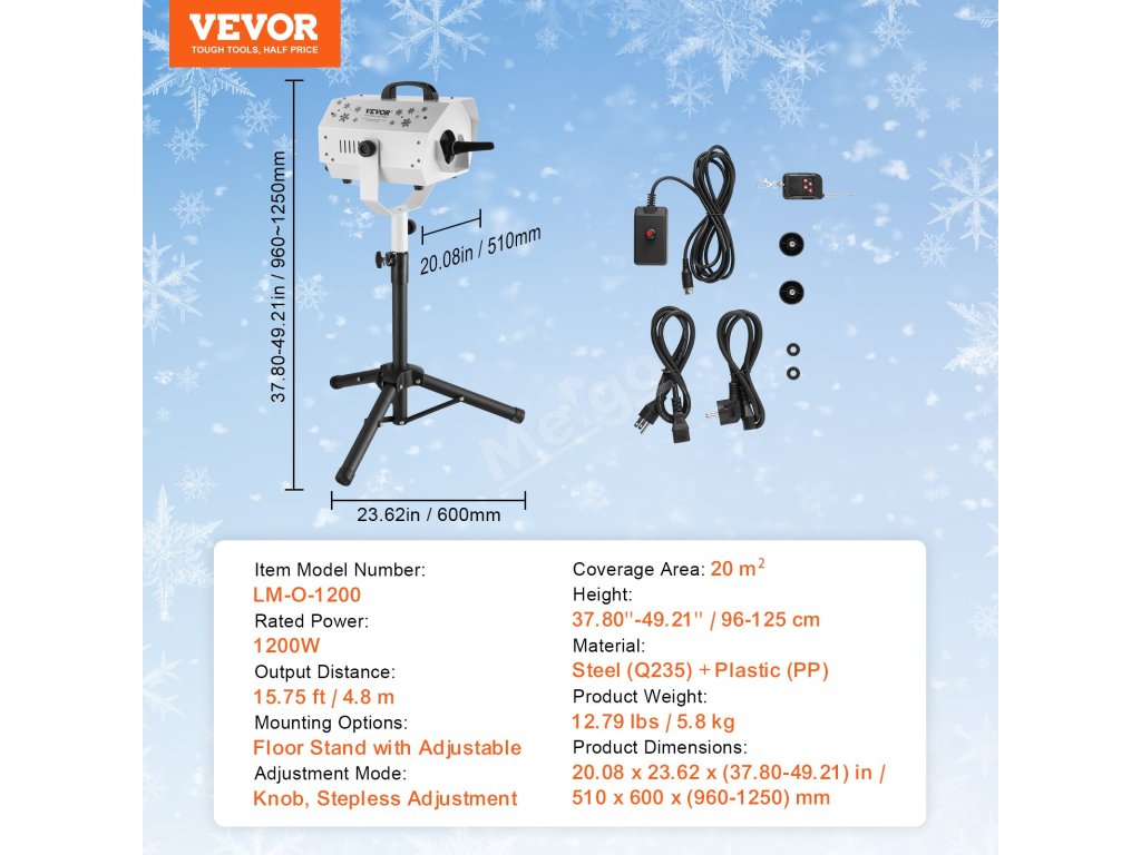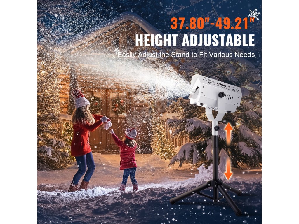 Stroj na výrobu sněhu 1200W, nastavitelný stojan, dálkové ovládání