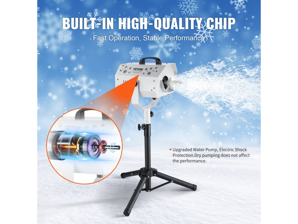 Sněžný stroj VEVOR s výškově nastavitelným stojanem je vybaven 1200W motorem pro delší produkci sněhu. Díky dlouhému dosahu stříkání a široké ploše pokrytí, elektronickému řídicímu systému termostatu a kvalitním čipům poskytuje stabilní výkon a nastavitelnou rychlost pro flexibilní přizpůsobení.
