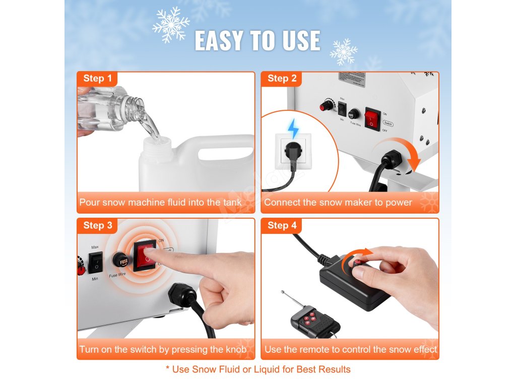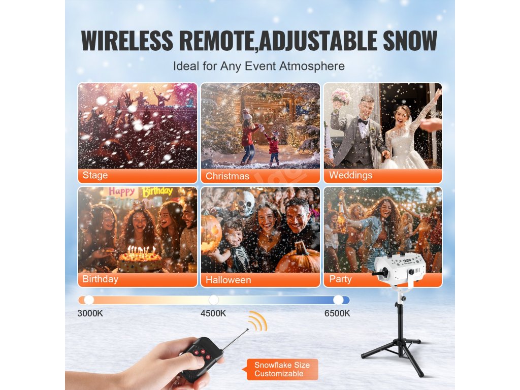 Ideální pro domácí výzdobu, vánoční večírky, přehlídky, narozeninové oslavy, sváteční akce, DJ sety a pódiová vystoupení. Tento sněžný stroj vytváří podmanivý efekt sněžení, který dokreslí atmosféru a na všechny zapůsobí.