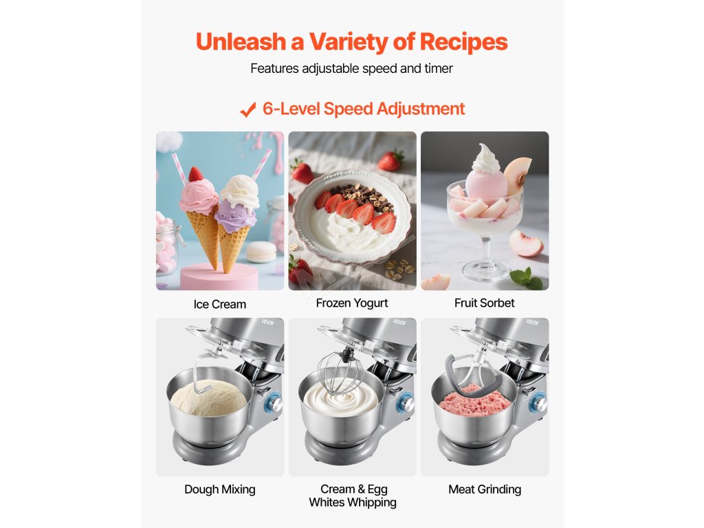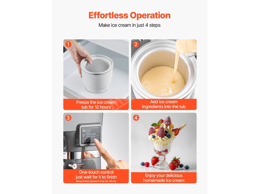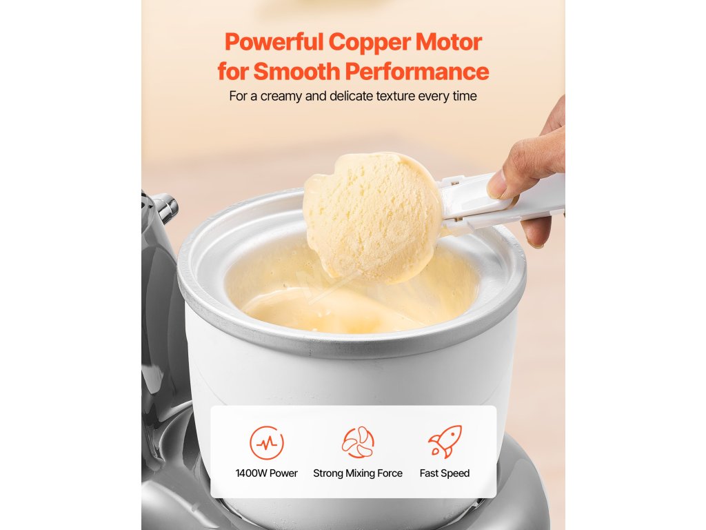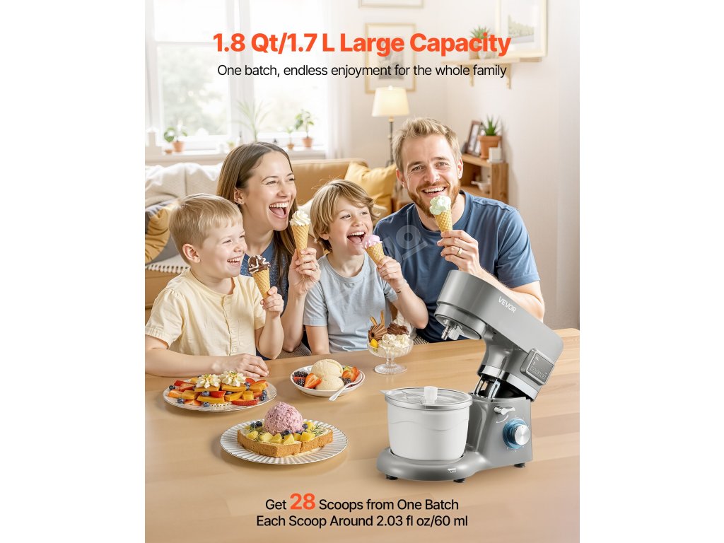 Tento zmrzlinovač s kapacitou 1,8 litru se snadno používá a je poháněn výkonným motorem pro důkladné promíchání. Za pouhých 35-45 minut vám pomůže vytvořit hladkou, krémovou zmrzlinu, ovocný sorbet, mražený jogurt a další. Přiložené víko odolné proti stříkající vodě udržuje proces čistý od začátku až do konce.