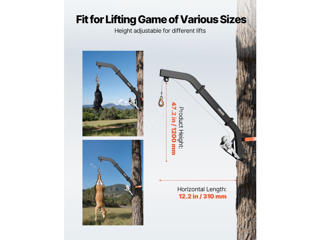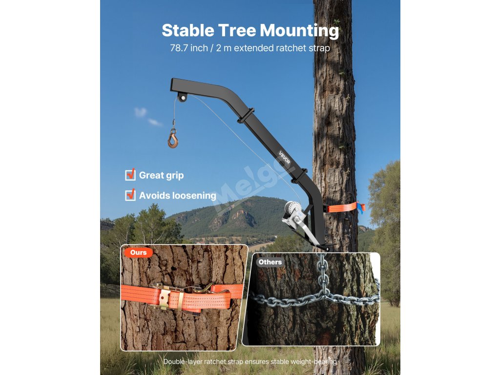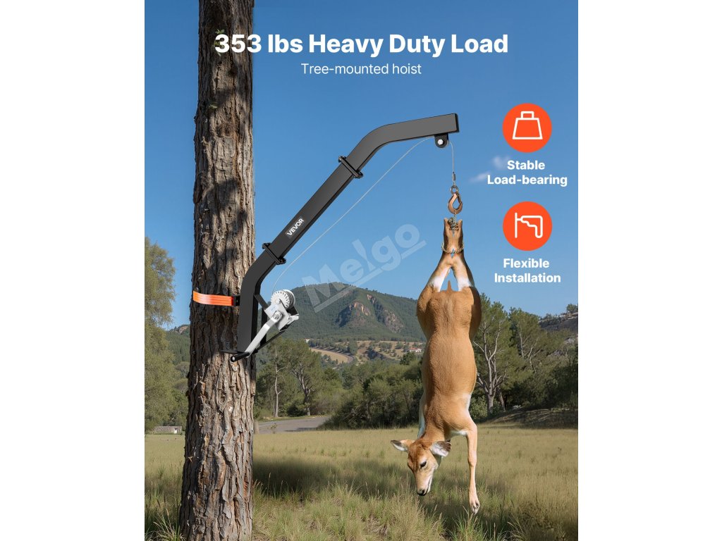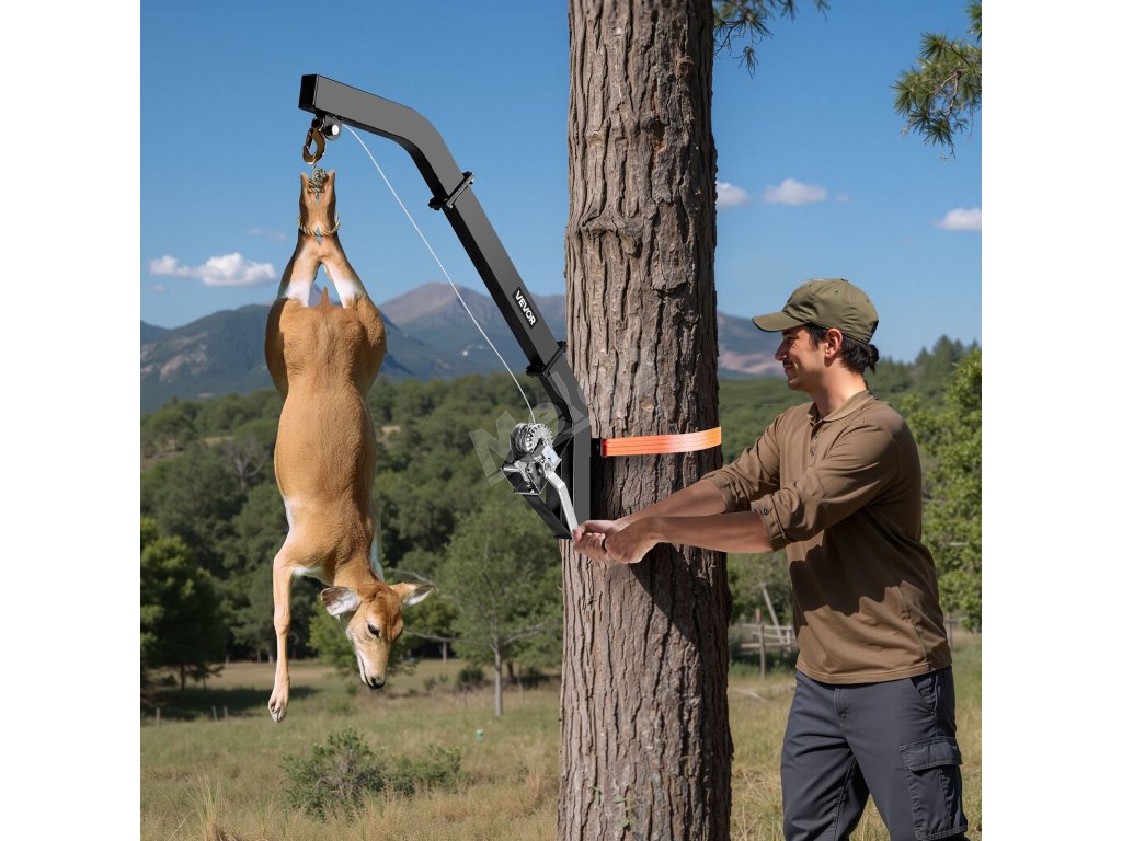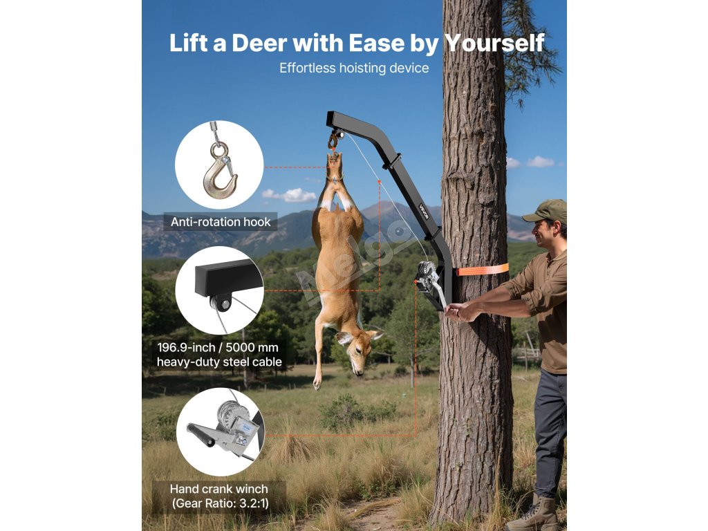 Náš jelení kladkostroj, poháněný vysokokapacitním ručním navijákem, snadno zvedne až 353 kg, takže je ideální pro zvedání zvěře nebo těžkých předmětů v přírodě.
