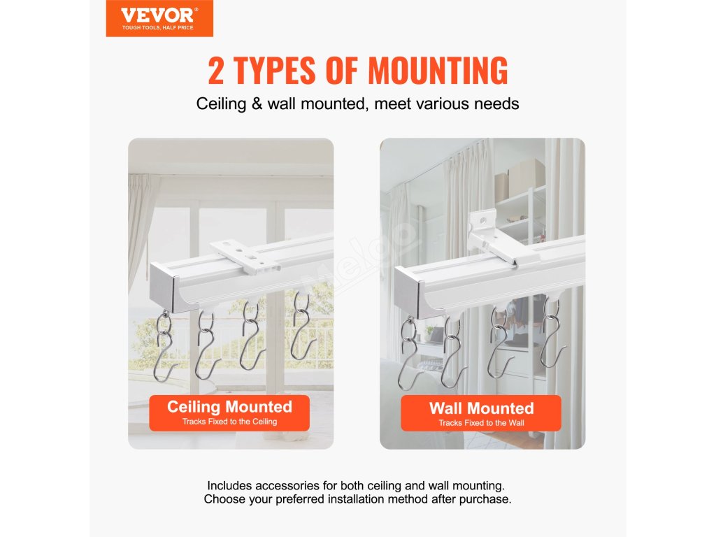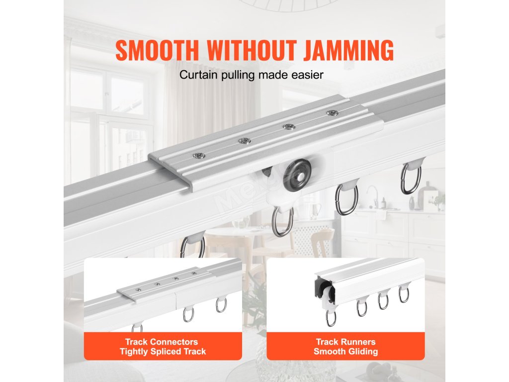 Systém záclonových kolejnic z vysoce odolné hliníkové slitiny lze bezpečně připevnit ke stropu nebo ke stěně, což zajišťuje vynikající nosnost. Nemusíte se obávat, že by záclony spadly.