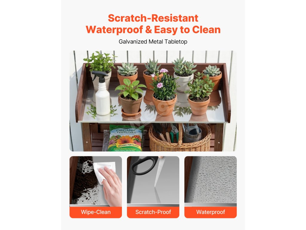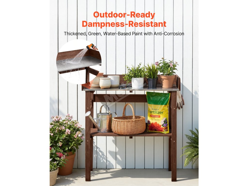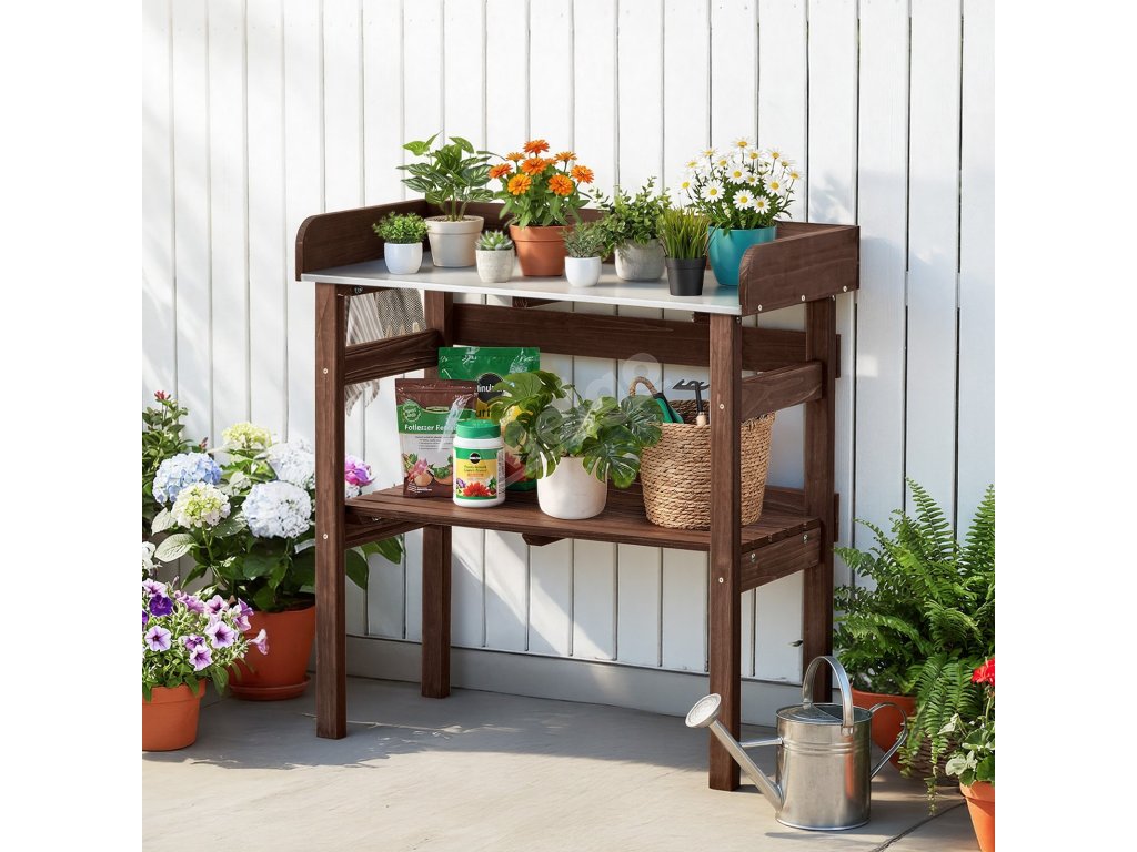 Tento venkovní stolek na rostliny je vybaven spodní policí pro uložení většího nářadí, hnojiv a dalších potřebných věcí na dosah.