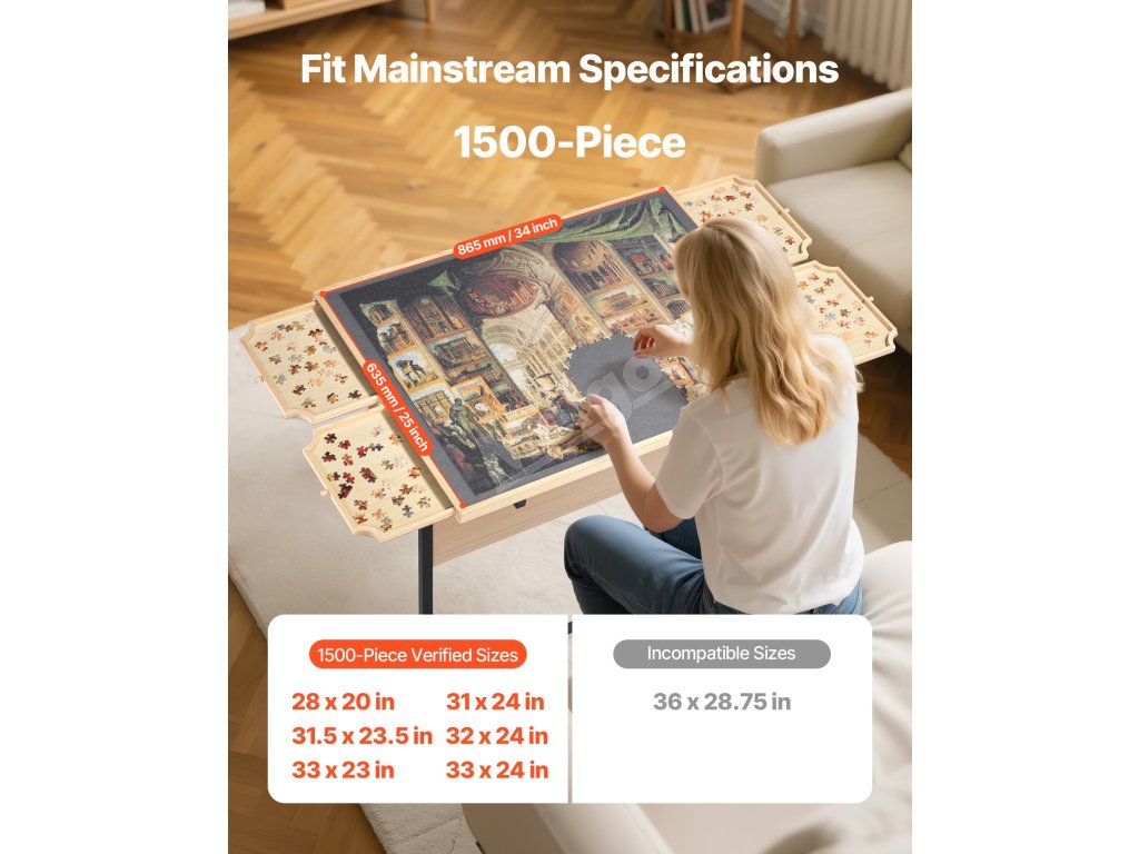 Naše desky na puzzle se zásuvkami a kryty mají rozměry vhodné pro většinu 1500dílných skládaček a nabízejí snadný a efektivní způsob vytváření krásných skládaček.