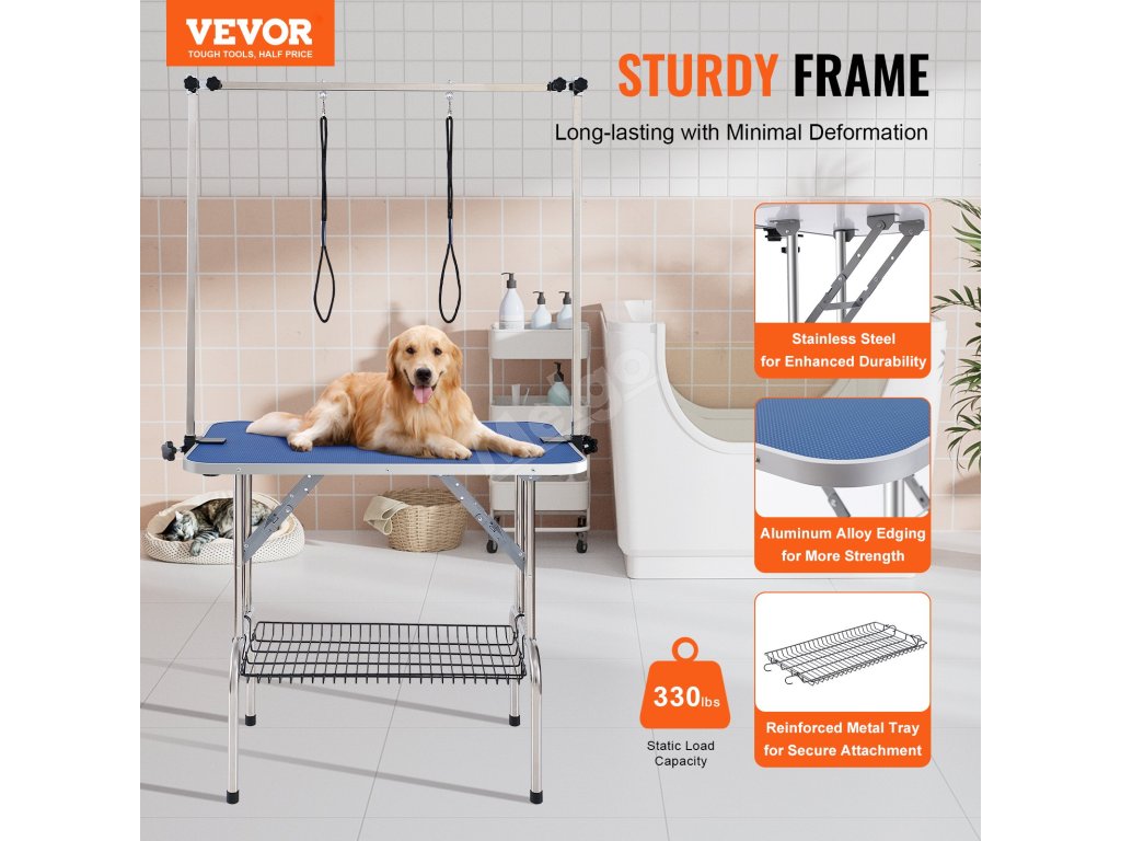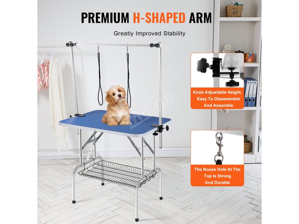 Stůl pro péči o domácí mazlíčky má nastavitelnou konstrukci ramene, která umožňuje celkové nastavení výšky a snižuje nutnost ohýbání. Nastavitelné rameno ve tvaru písmene H dále zvyšuje stabilitu.