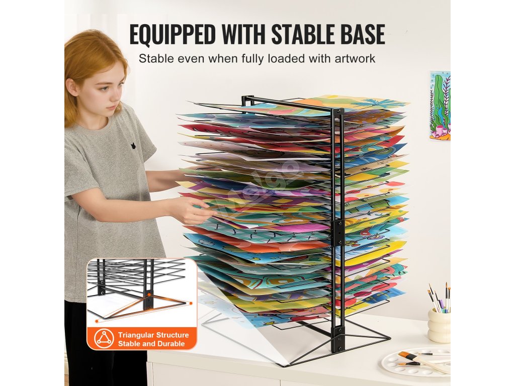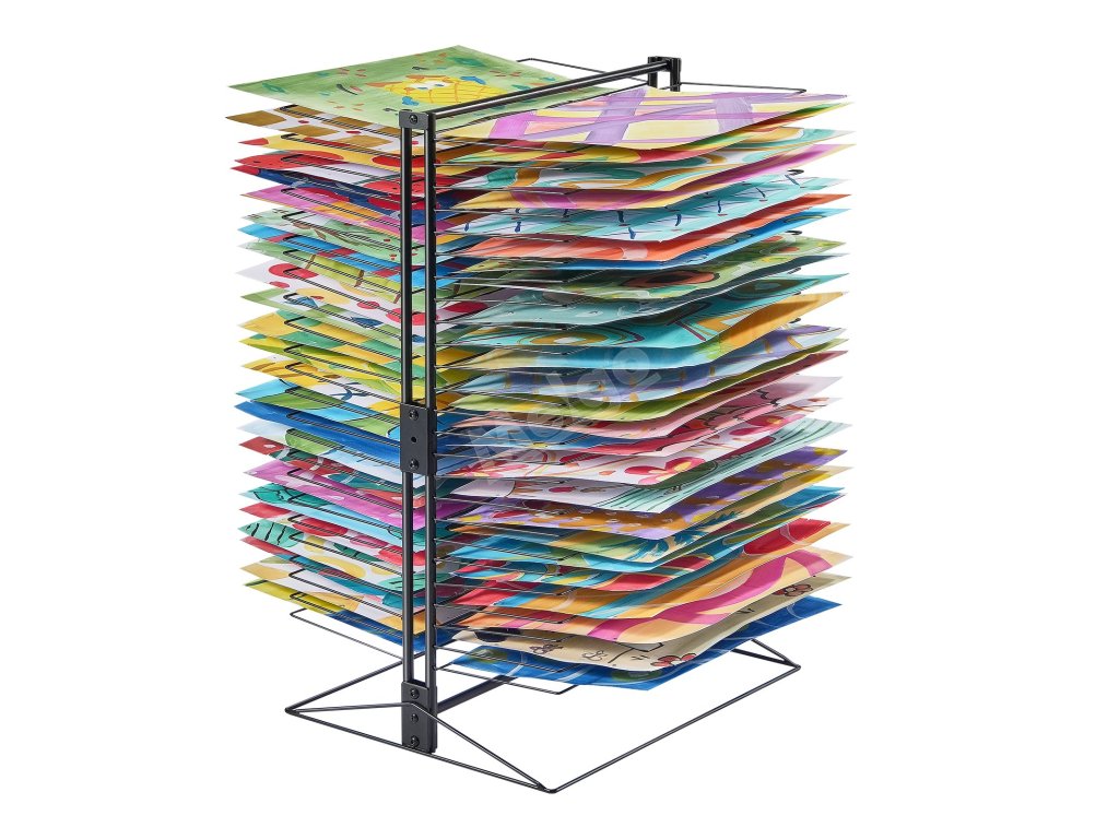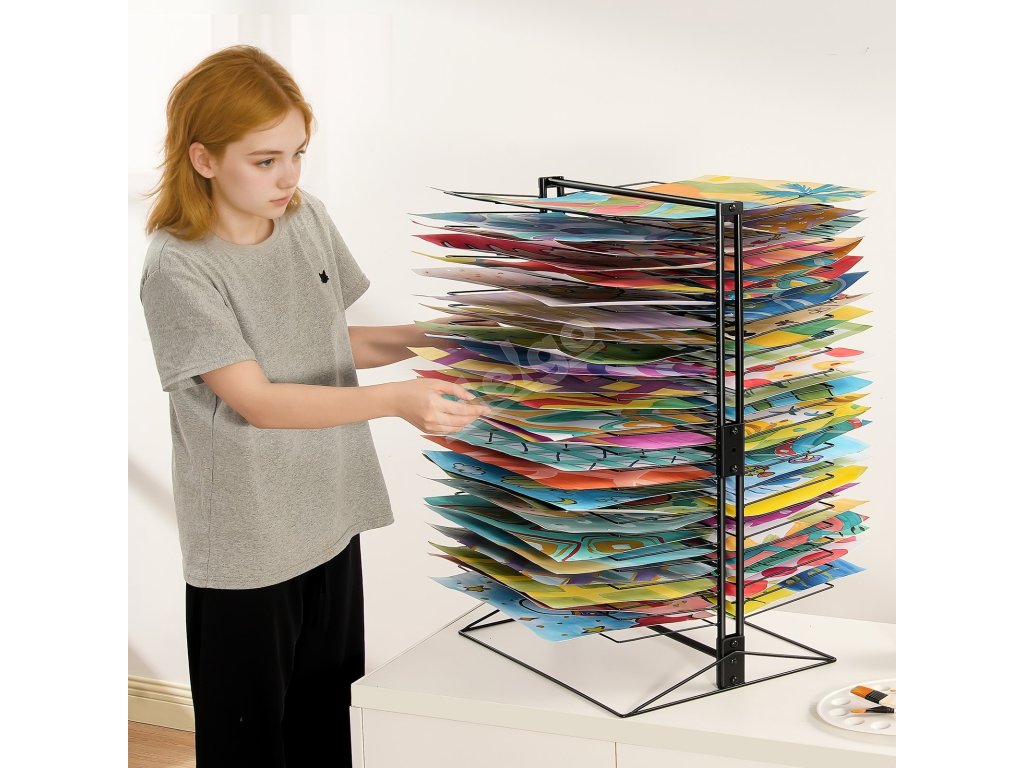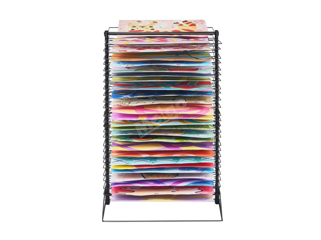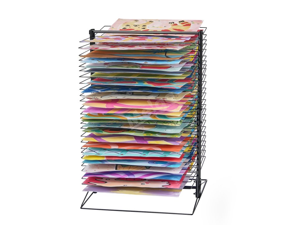 Tento stojan na sušenie obrazov, ktorý je celý vyrobený z kovu, je konštruovaný tak, aby udržal veľké množstvo umeleckých diel bez toho, aby sa ohýbal alebo deformoval. Do políc možno umiestniť rôzne veľkosti papiera vrátane formátov A4, A3 a A2. Aj pri plnom zaťažení si zachováva stabilitu bez rizika zrútenia.