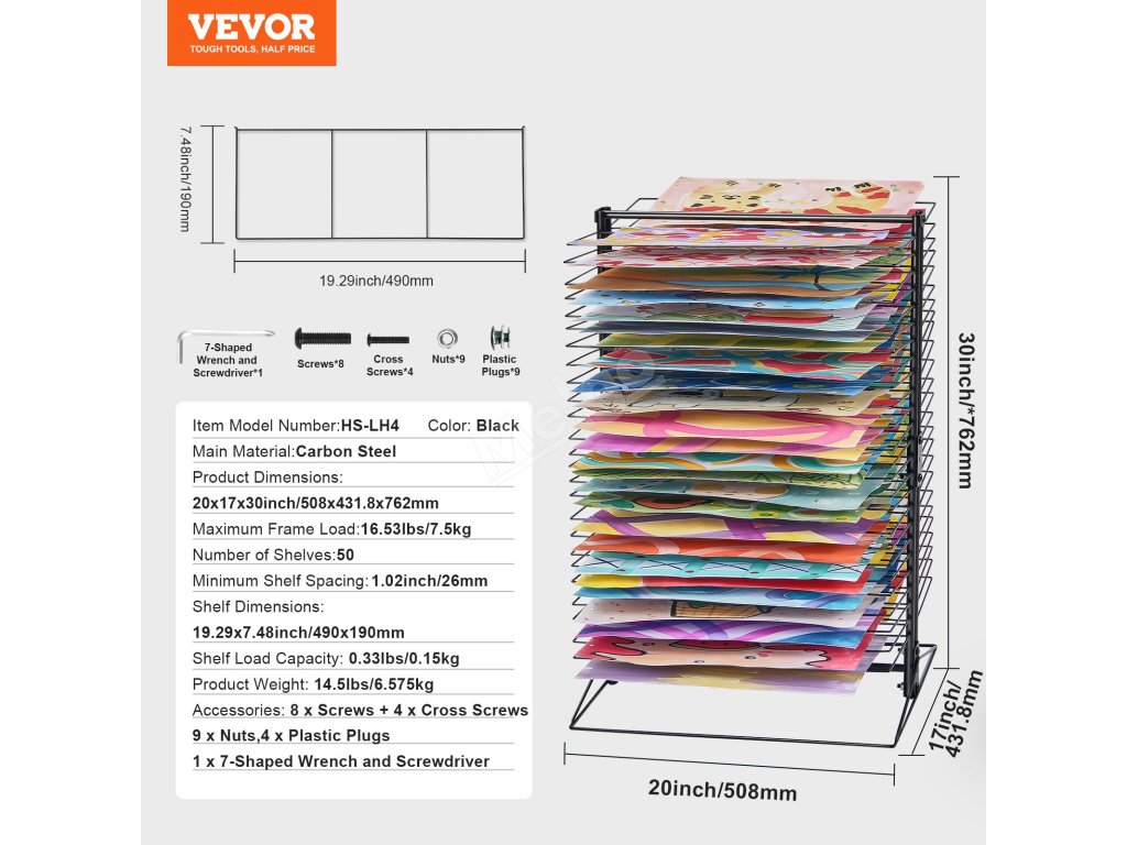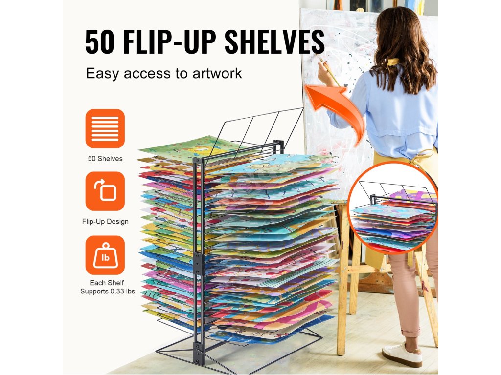 Všetkých 50 políc je nastaviteľných tak, aby vyhovovali rôznym potrebám sušenia, a umožňuje jednoduché vkladanie alebo vyberanie, aby sa zabránilo rozmazaniu mokrých umeleckých diel. Kovová konštrukcia s práškovou povrchovou úpravou zaisťuje hladký každý roh, čím zabraňuje poškriabaniu a zároveň je odolná a estetická.