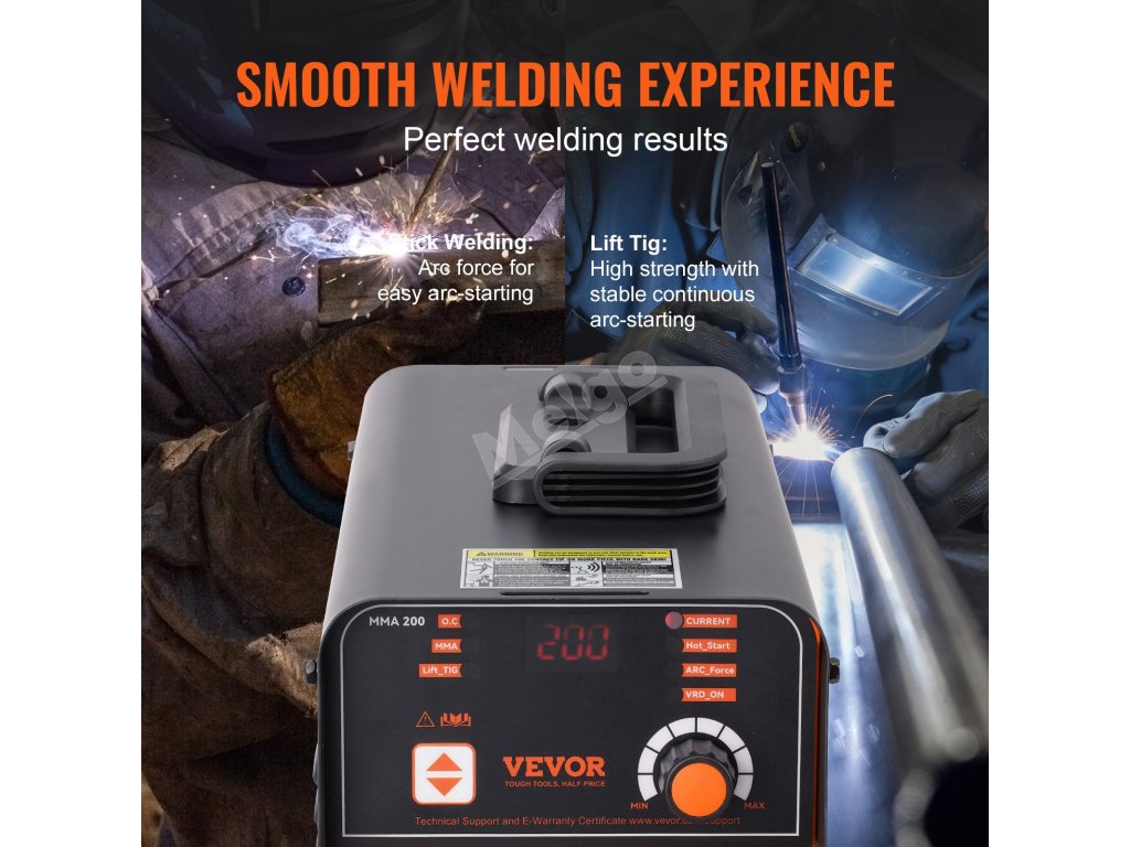 Zváračka VEVOR Stick and Lift Tig je vybavená dvoma režimami zvárania s automatickým prepínaním jedným dotykom, je vhodná na zváranie nehrdzavejúcej ocele, mäkkej ocele a iných kovov, je dodávaná s odolným držiakom elektród, zemniacou svorkou a zváracou tyčou, takže môžete začať zvárať hneď.