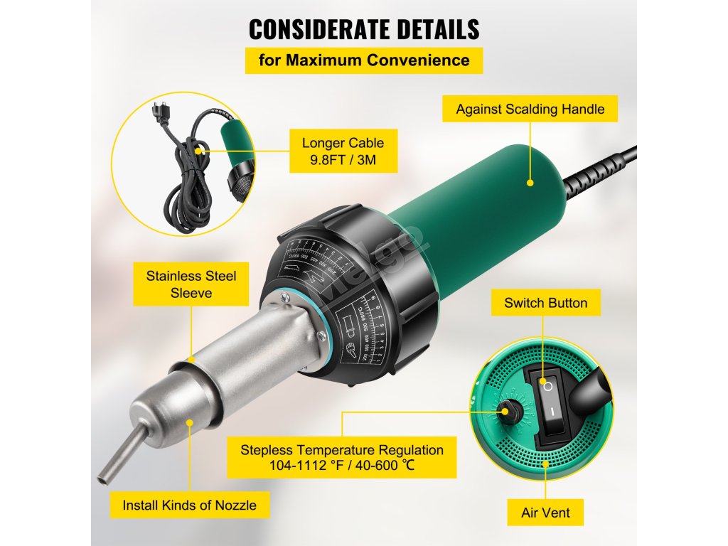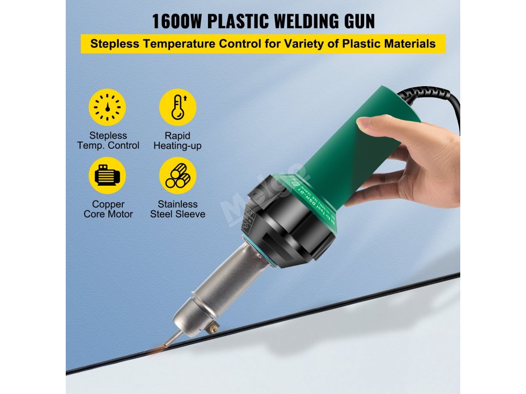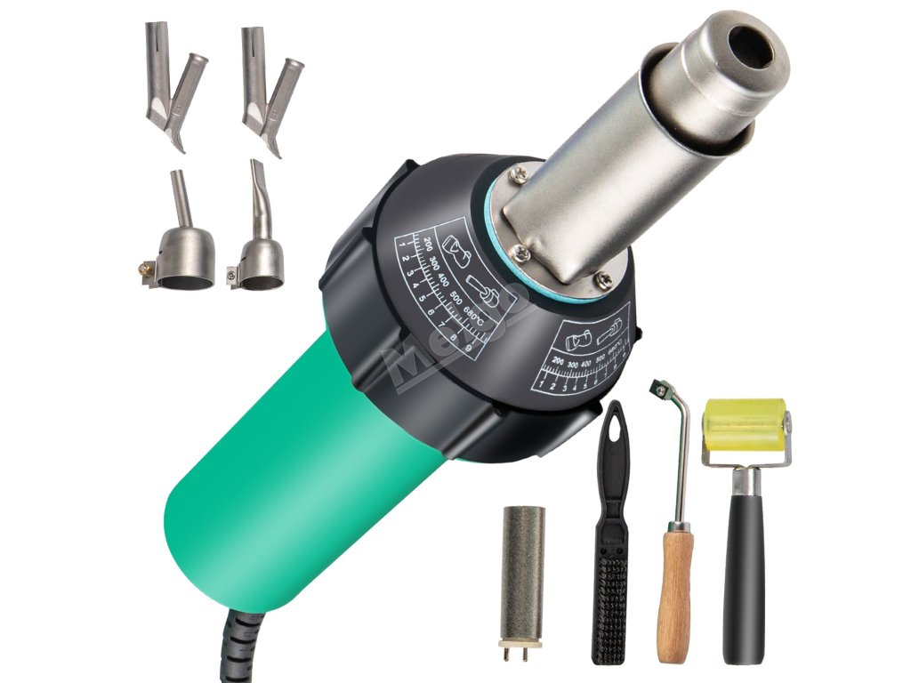 Motor z čisté mědi má výkon 1600 W a je vybaven mnoha druhy svařovacích trysek pro renovaci střech, údržbu tunelů, opravy plachet a reklamních textilií.