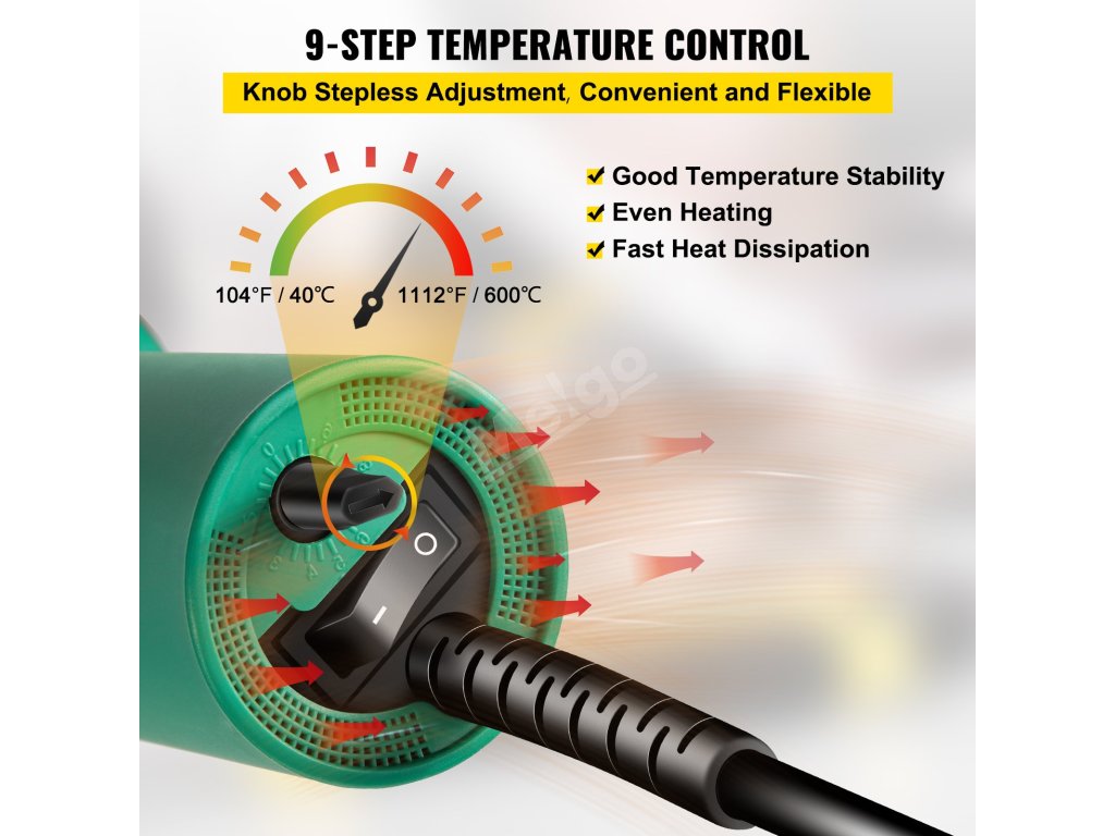 Výstupní výfuk odvádí teplo a zabraňuje přílišnému zahřívání stroje. Teplotu můžete nastavit pomocí knoflíku a snadno se ovládá.