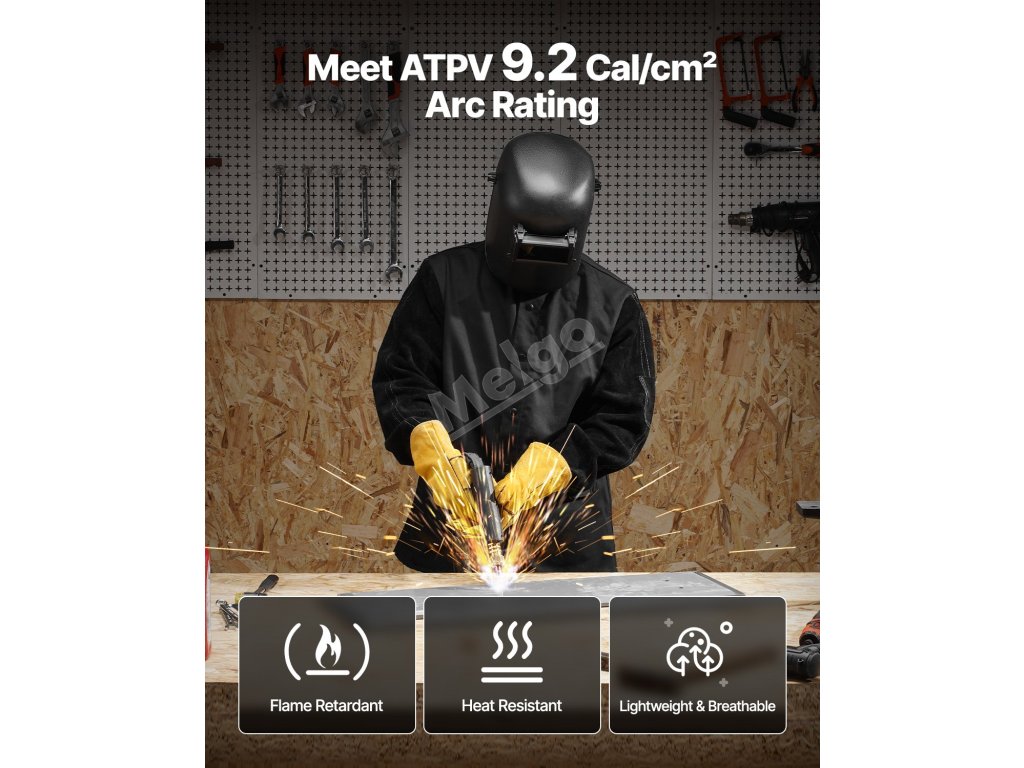 Tento univerzální nehořlavý svářečský plášť nabízí výjimečnou ochranu, dosahuje úrovně ochrany proti oblouku ATPV 9,2 Cal/cm² a účinně odolává vysokým teplotám a plamenům.