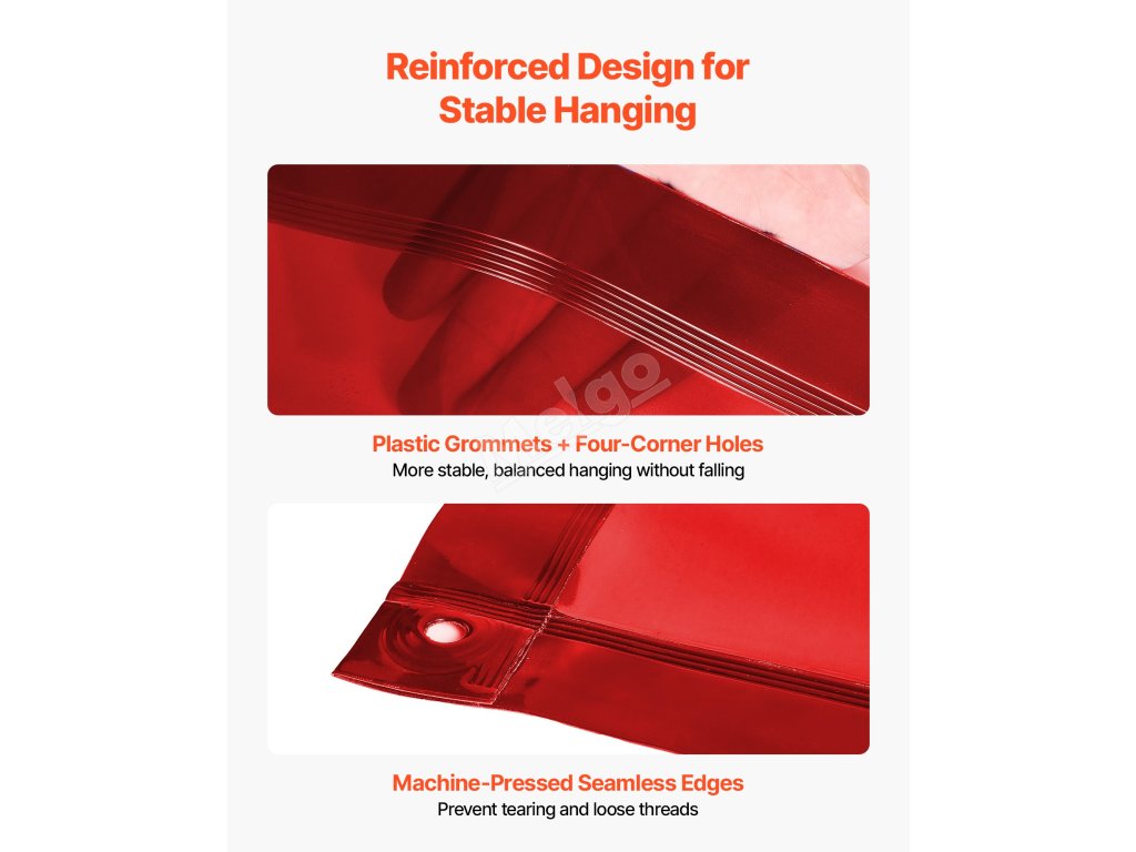 Každá bezpečnostní svářečská zástěna je dodávána s 18 plastovými průchodkami, které zajišťují rychlou instalaci a bezpečné a vyvážené zavěšení. Bezešvé strojově tvarované okraje dodávají zesílenou pevnost, která zabraňuje roztržení a poškození a zajišťuje tak vynikající odolnost.
