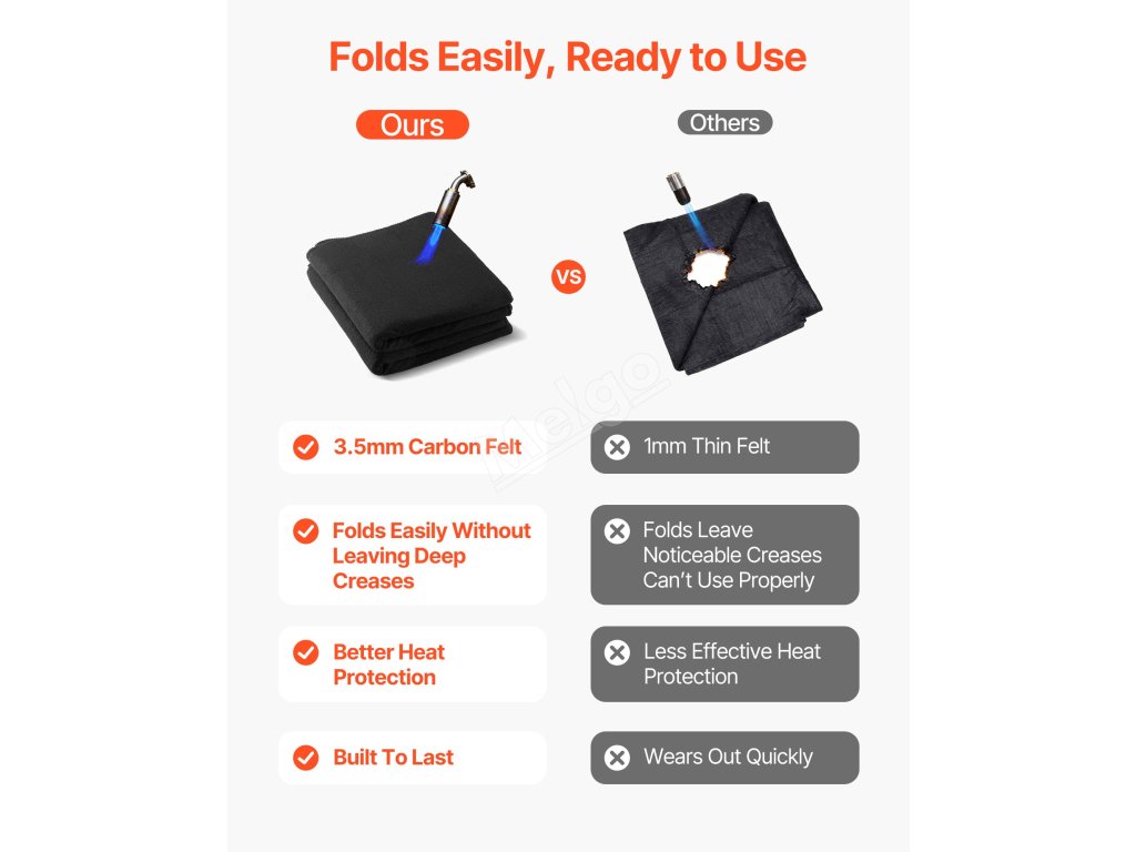 Svářecí deka VEVOR z uhlíkové plsti v balení 2 kusů o rozměrech 20" x 36" odolává teplotám až 1800 °C a nabízí trvalou odolnost proti plameni, chrání před jiskrami a roztavenými svářečskými rozstřiky. Zůstaňte v bezpečí před rizikem požáru a užijte si bezpečnější a efektivnější práci.