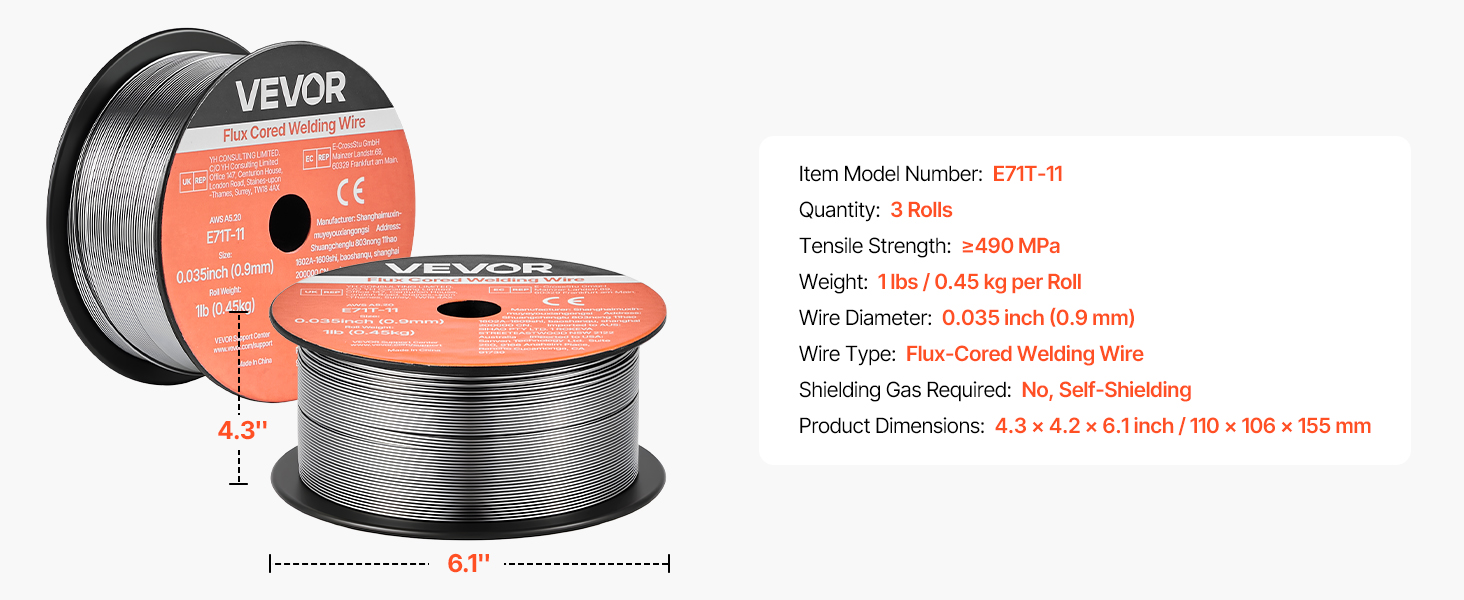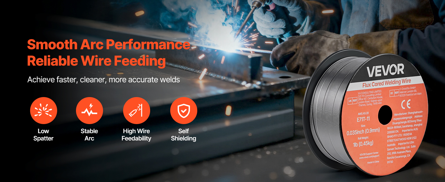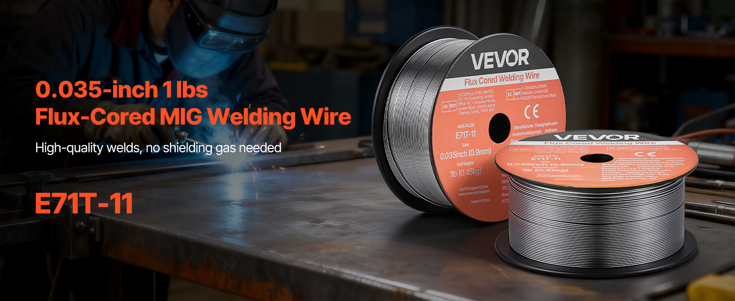 Tavný svařovací drát VEVOR 0,035" 1 lbs E71T-11 poskytuje pevné a konzistentní svary s hladkým posuvem drátu a nízkým rozstřikem. Podporuje svařování bez plynu ve všech polohách, vícenásobné svařování a vysokou pevnost v tahu pro spolehlivý výkon při svařování v automobilovém průmyslu, strojírenství a kutilských projektech.