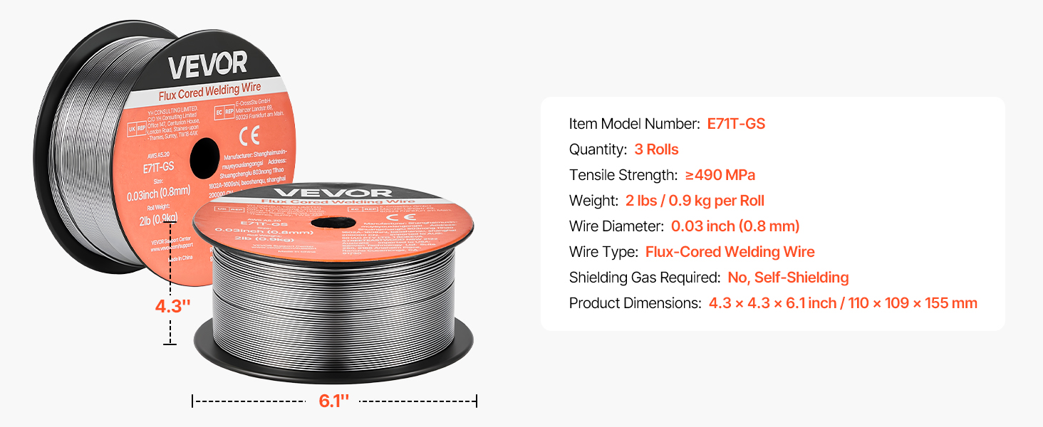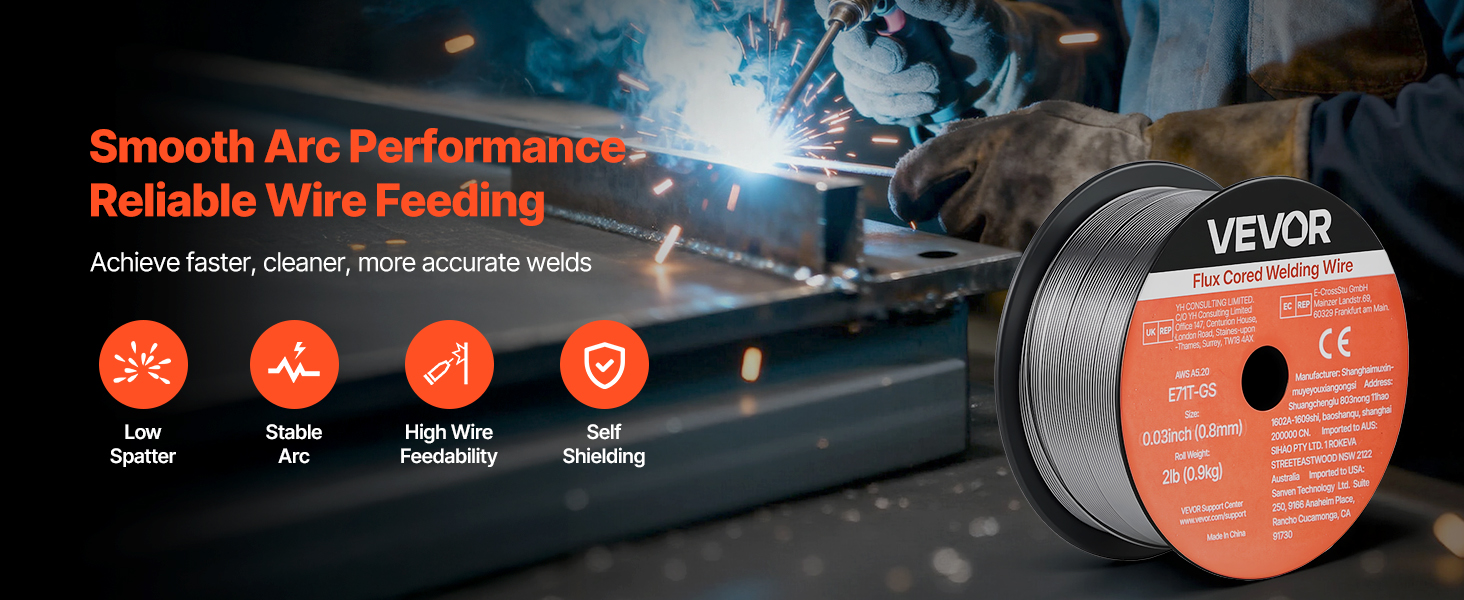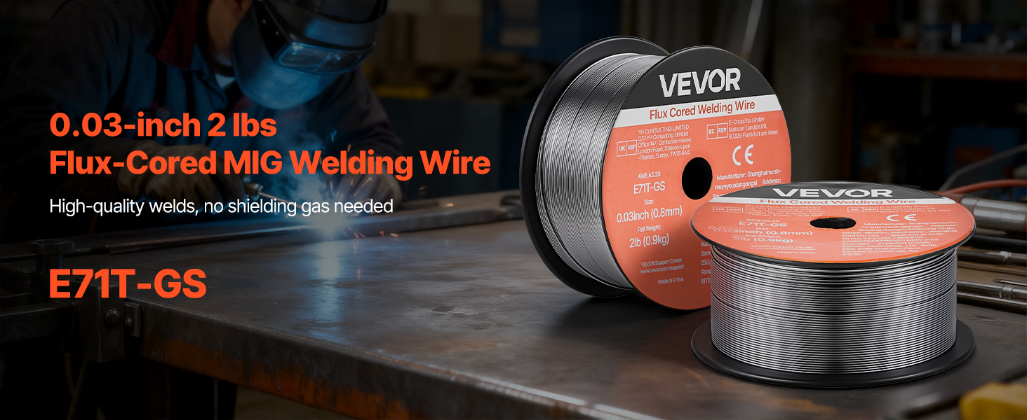 Svařovací drát VEVOR 0,03" 2 lbs E71T-GS pro svařování metodou MIG s tavidlem poskytuje pevné a konzistentní svary s hladkým posuvem drátu, nízkým rozstřikem a samostíněním. Podporuje svařování bez plynu ve všech polohách a vysokou pevnost v tahu pro spolehlivý výkon v automobilovém průmyslu, strojírenství a při svařování pro kutily.