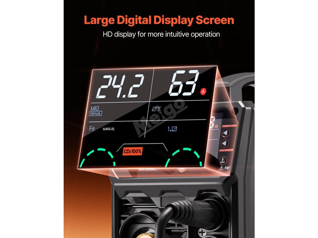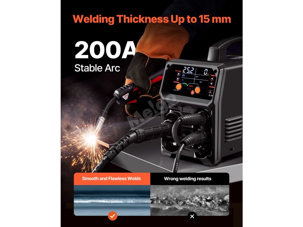 Tato svářečka poskytuje silný výstupní proud 200 A, který umožňuje svařovat materiály o tloušťce až 15 mm.
