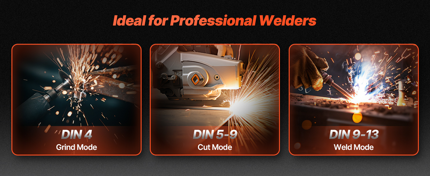 Tato svářečská přilba má nastavitelné stupně odstínu DIN - DIN 4 (režim broušení), DIN 5-9 (režim řezání) a DIN 9-13 (režim svařování) - a umožňuje snadno přepínat režimy podle různých úkolů, čímž zvyšuje efektivitu a bezpečnost práce.
