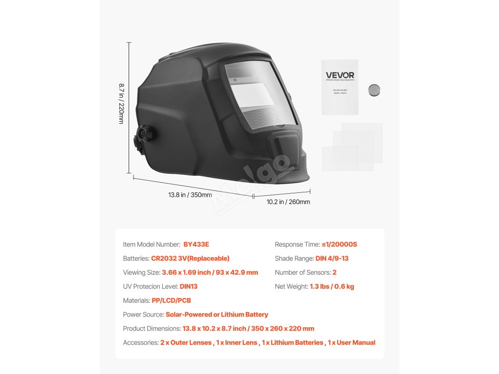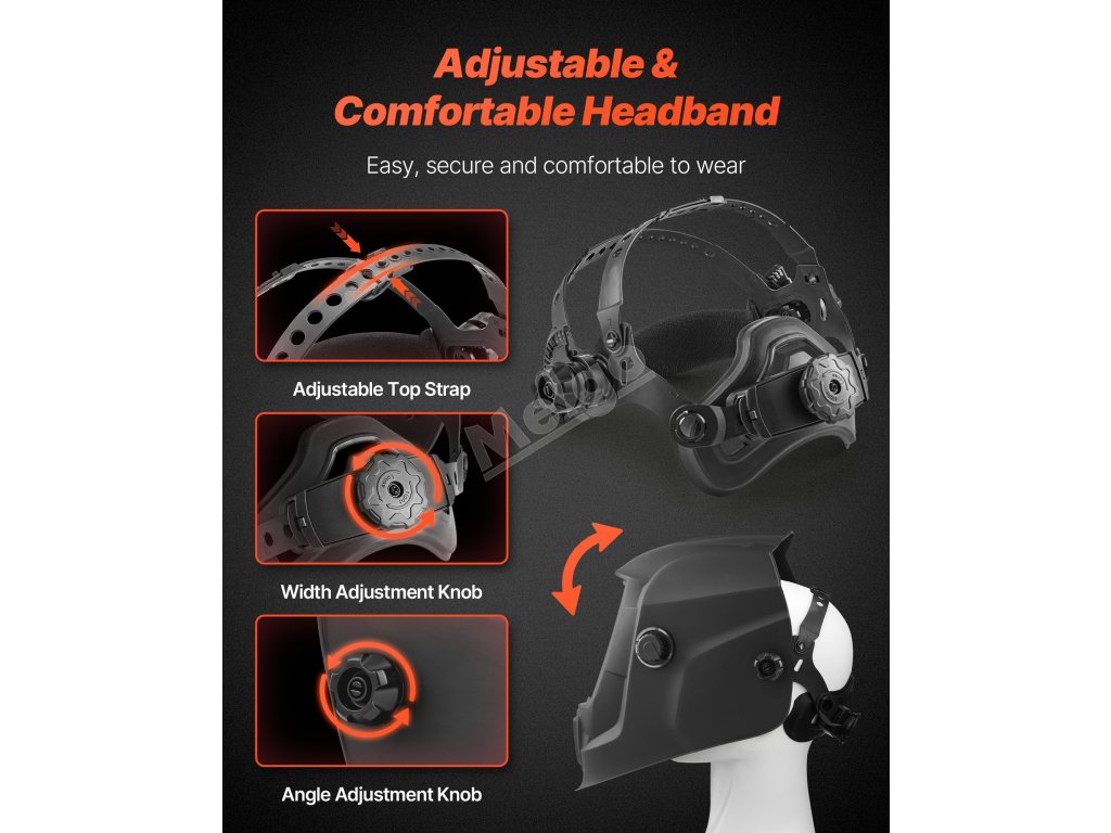 Svářečská přilba VEVOR s automatickým stmíváním má široký rozsah odstínů DIN 4/9-13, technologii věrných barev a 2 obloukové senzory, které zajišťují jasnější a přirozenější zobrazení. Účinně filtruje škodlivé světlo, snižuje únavu očí a zvyšuje bezpečnost broušení a svařování.