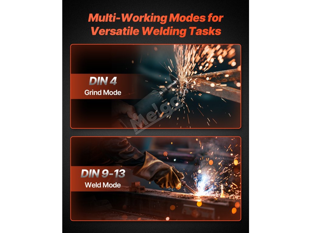 Tato svářečská přilba je vybavena nastavitelnými úrovněmi odstínu DIN - DIN 4 (režim broušení) a DIN 9-13 (režim svařování) - a umožňuje snadné přepínání režimů pro různé úkoly, což zvyšuje efektivitu a bezpečnost práce.