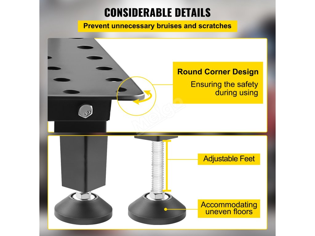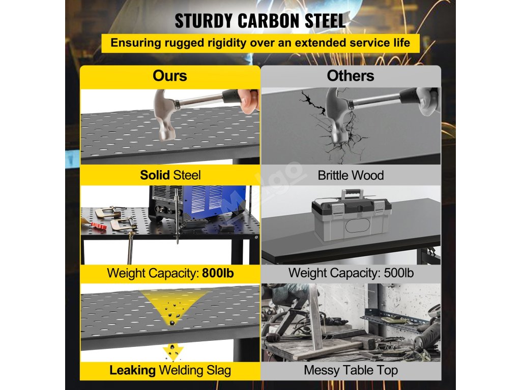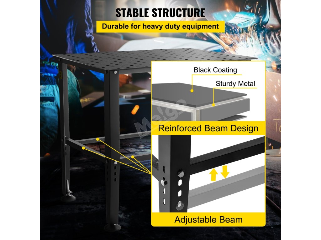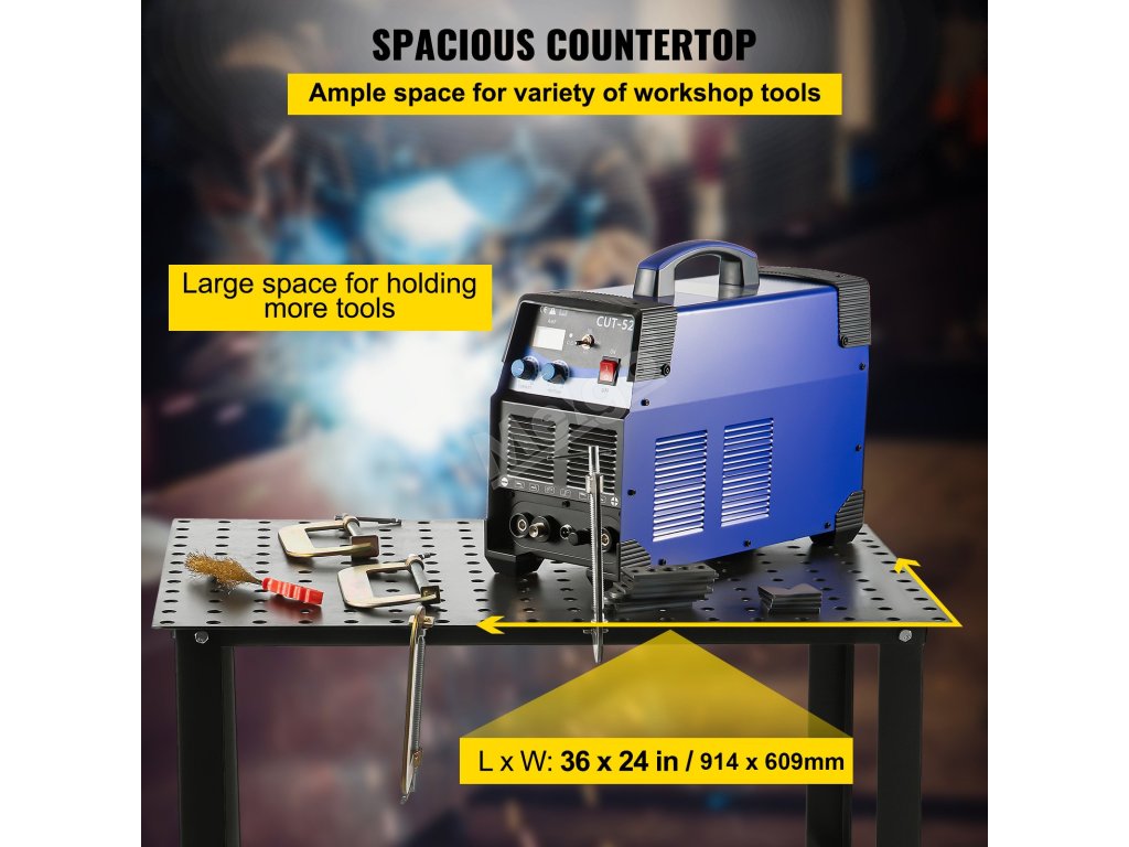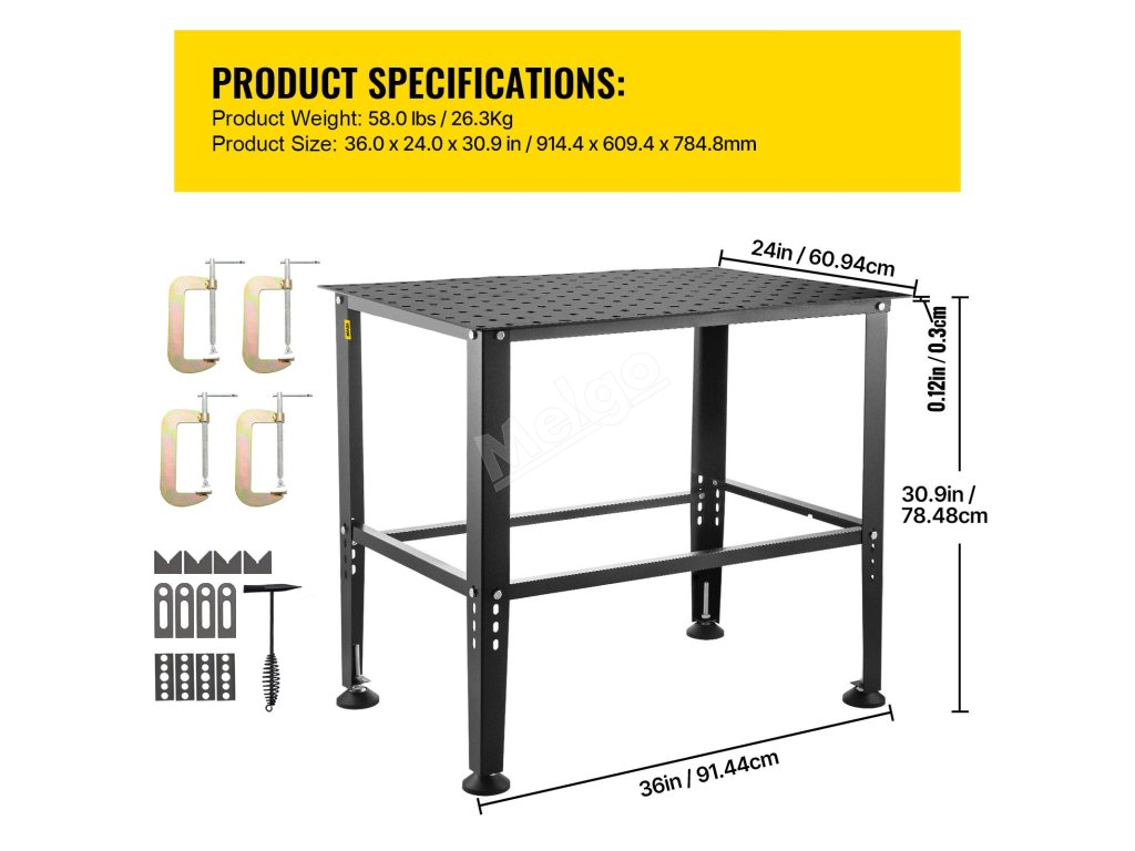 Svařovací stůl VEVOR 36 x 24 palců - váš dokonalý společník při svařování. nosnost 800 liber, montážní otvory o průměru 0,63 palce, protiskluzové podložky pod nohy a prostorná pracovní plocha slibují všestrannost pro vaše svářecí projekty. Dejte sbohem frustrujícím pracovním plochám a zvyšte efektivitu svařování.