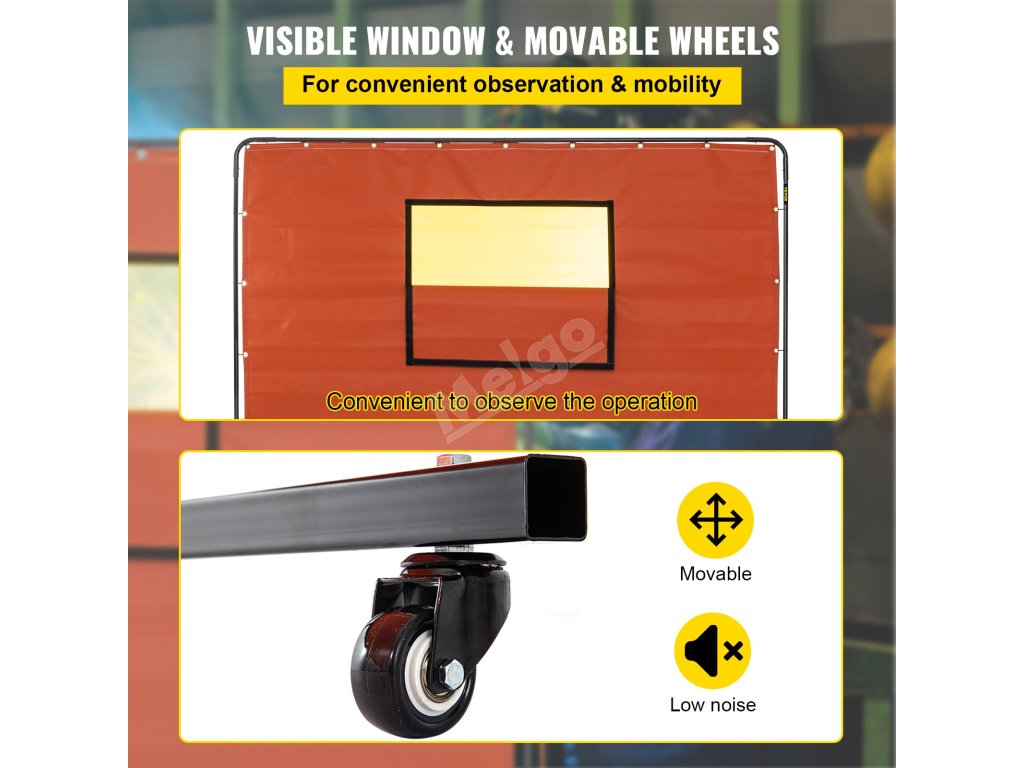 Průhledné okénko umožňuje kdykoli pozorovat oblast mimo svařovací prostor. Kromě toho vám flexibilní kolečka umožňují snadné ovládání vinylové svářecí zástěny.