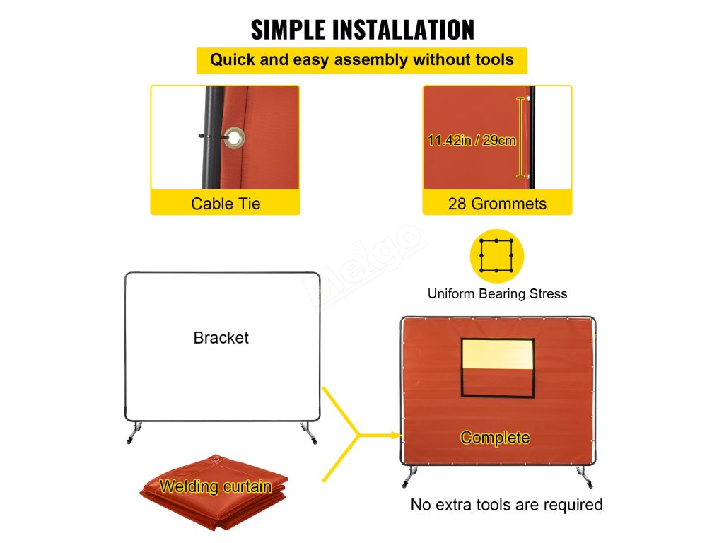 Pro instalaci svařovací zástěny je k dispozici dostatečné množství nylonových vazeb. Nejsou zapotřebí žádné další nástroje pro nastavení a jednoduchou instalaci zvládne jedna osoba.