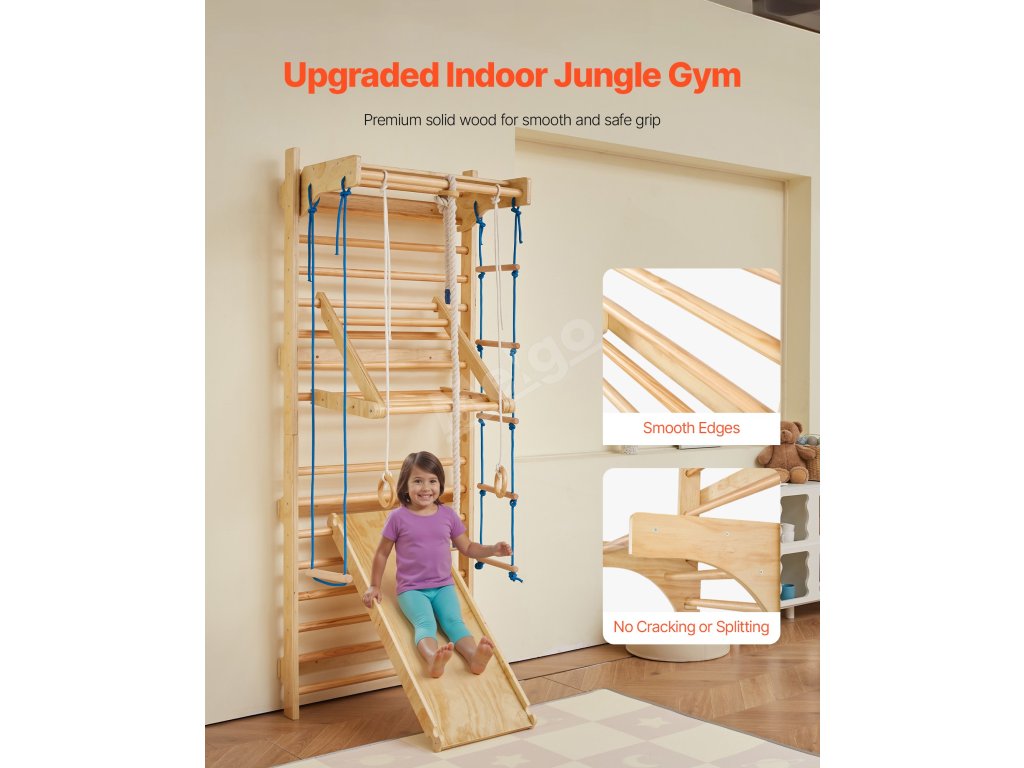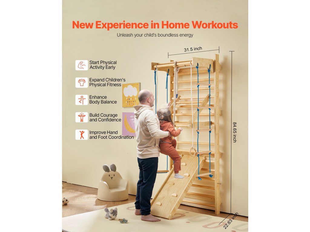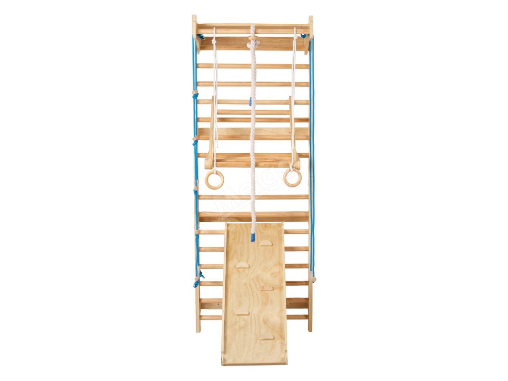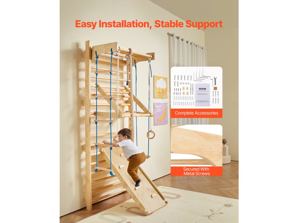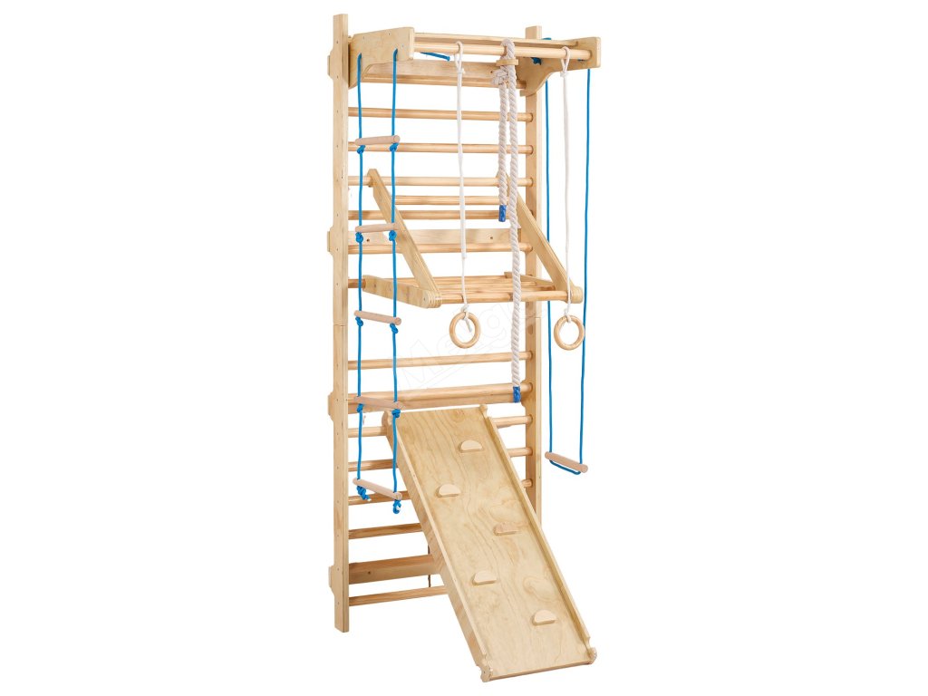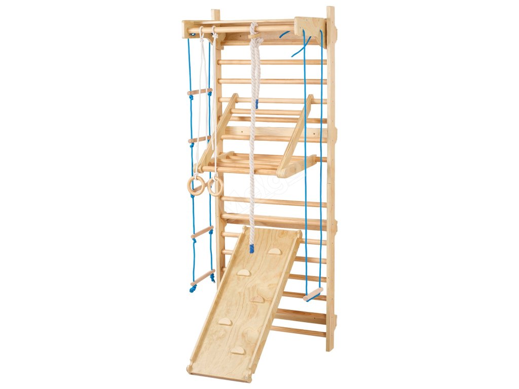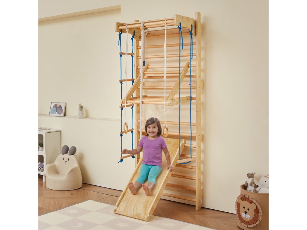 Tento švédský nástěnný žebřík 8 v 1 se dodává s několika zábavnými doplňky - včetně prolézačky, gymnastických kruhů, provazových žebříků, skluzavky, houpačky a dalších. Pomáhá dětem zlepšit koordinaci, rovnováhu, sílu a sebevědomí prostřednictvím pohybu celého těla a poutavé hry.